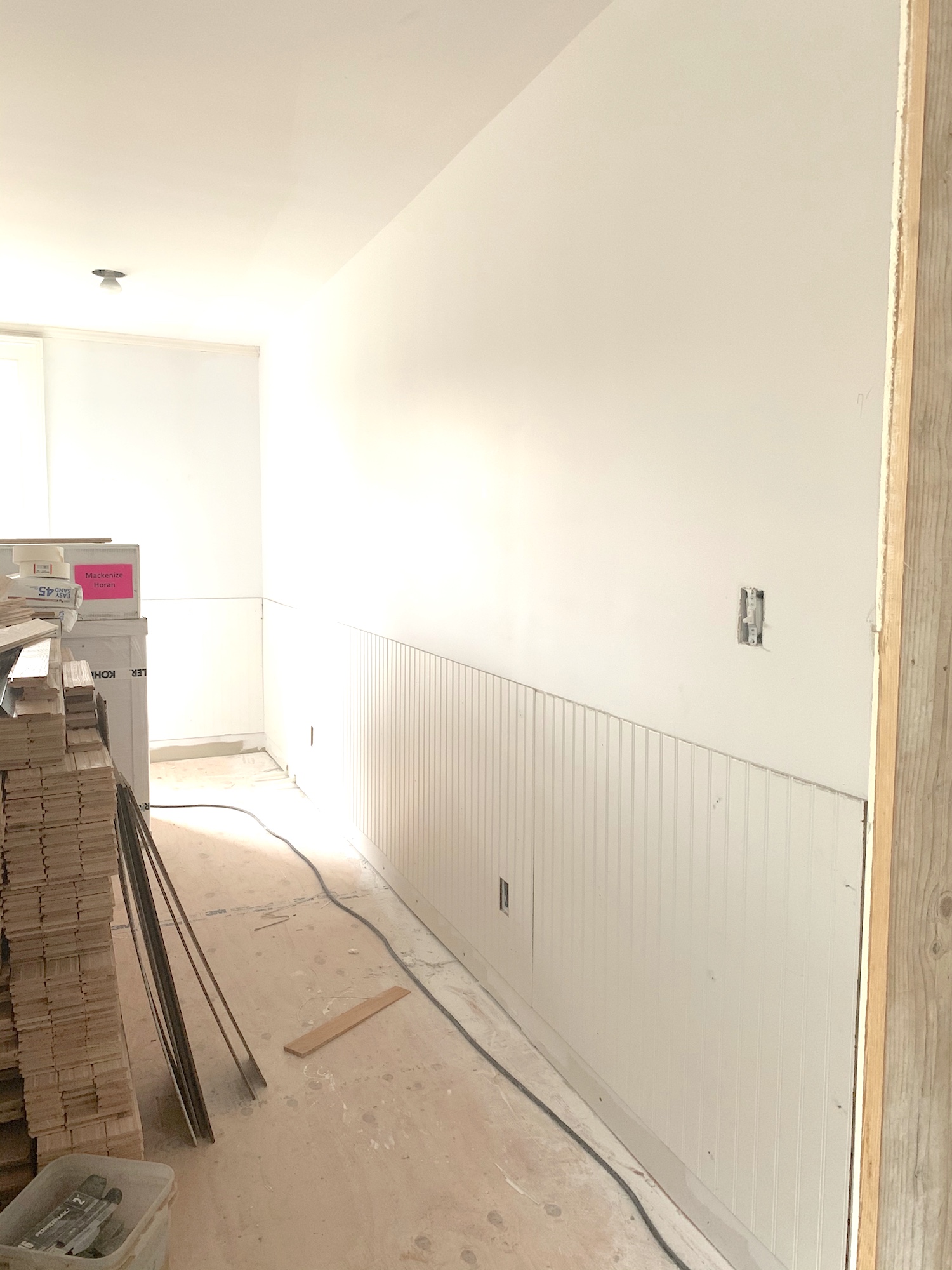 While we painted, my dad and my brother Grayson put up beadboard in the playroom between the mudroom and our living room. They used the same beadboard that my dad put up in Teddy’s nursery last summer and you can read a little about the steps he follows in this post. We’re wallpapering the playroom to break up the white walls in the living room and mudroom on either side of it and the beadboard massively cuts down on how many rolls of wallpaper we need. ??