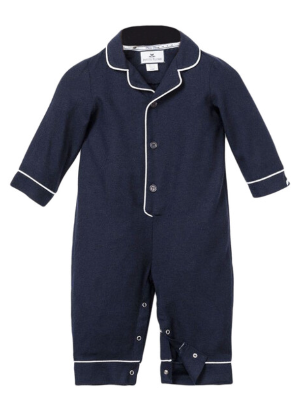 Petite Plume navy pajamas with white piping, $48