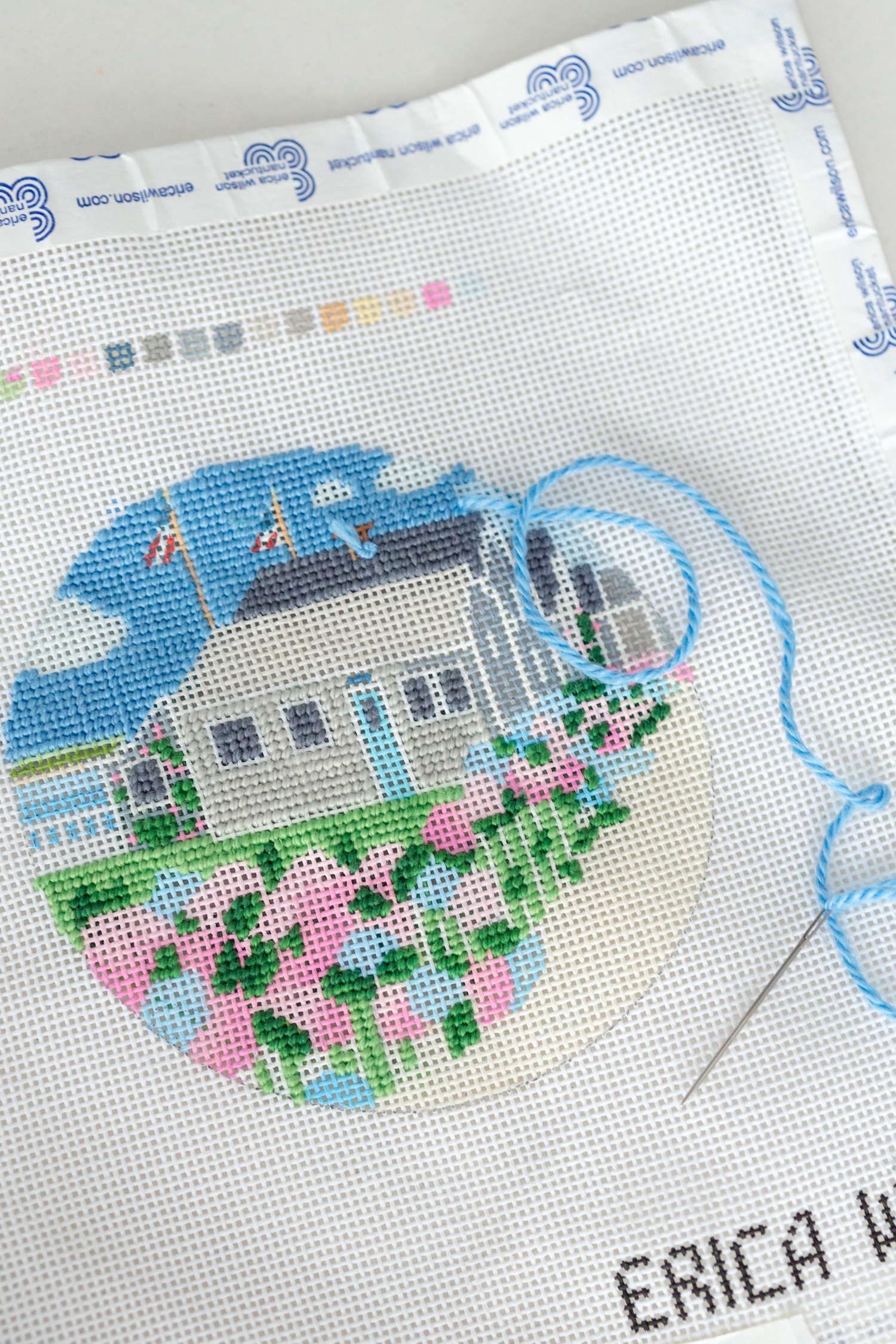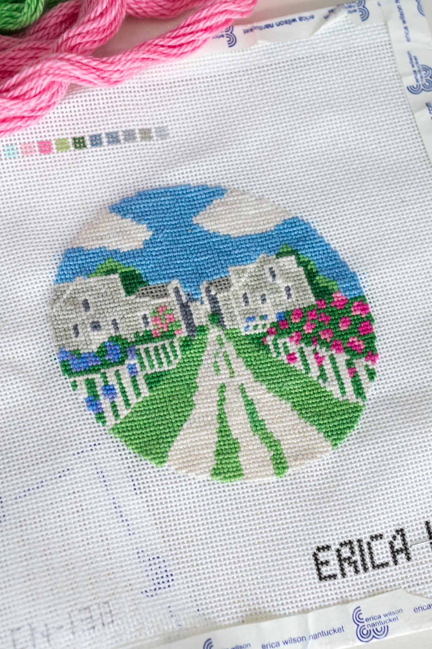 With my last two big needlepoint projects complete — a custom house canvas for my mom and Rory’s Christmas stocking! — I thought I’d share my current works in progress. I bought these Erica Wilson x Meredith Hanson canvases two summers ago at their store on Nantucket and am excited to finally give them the time they deserve! I’m 99% finished stitching two of them (was missing a couple thread colors on our trip to Barbados!) and just started on the third and I’m hoping I’ll have them finished in time to hang as ornaments on our Christmas tree at the end of this year. Highly recommend checking out the whole collection here if you need a new project — Meredith Hanson is a wildly talented artist and I love seeing her work in needlepoint form!