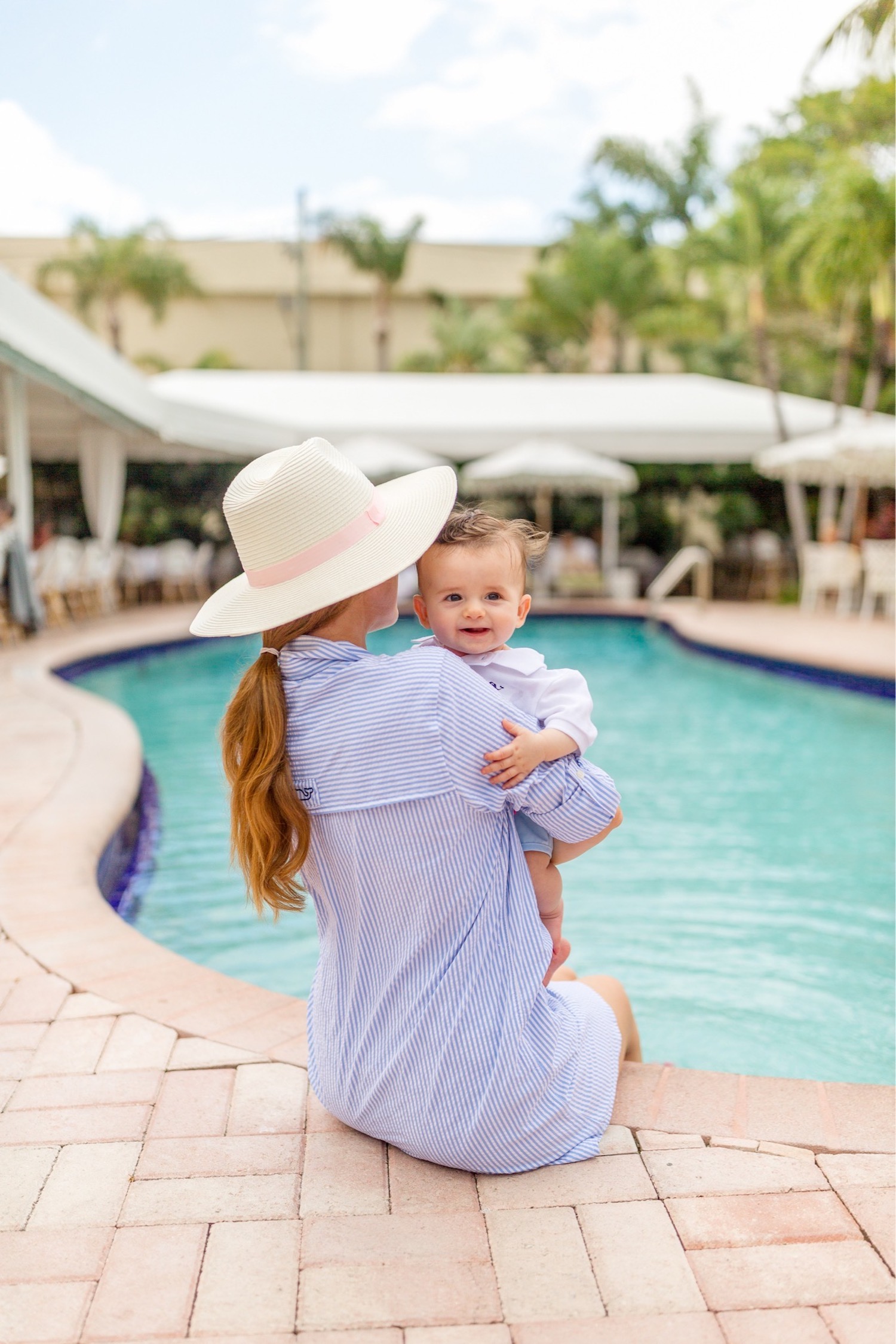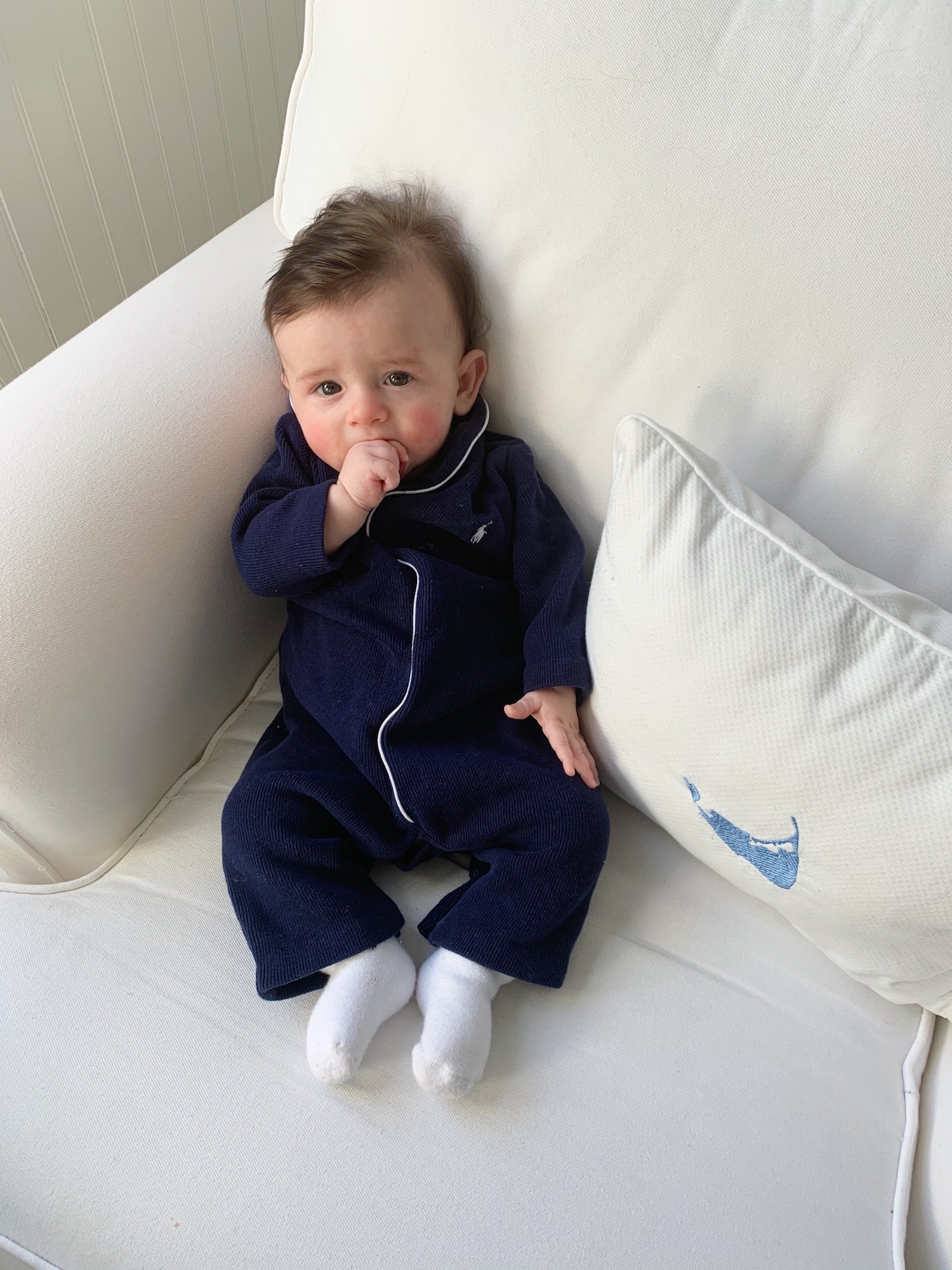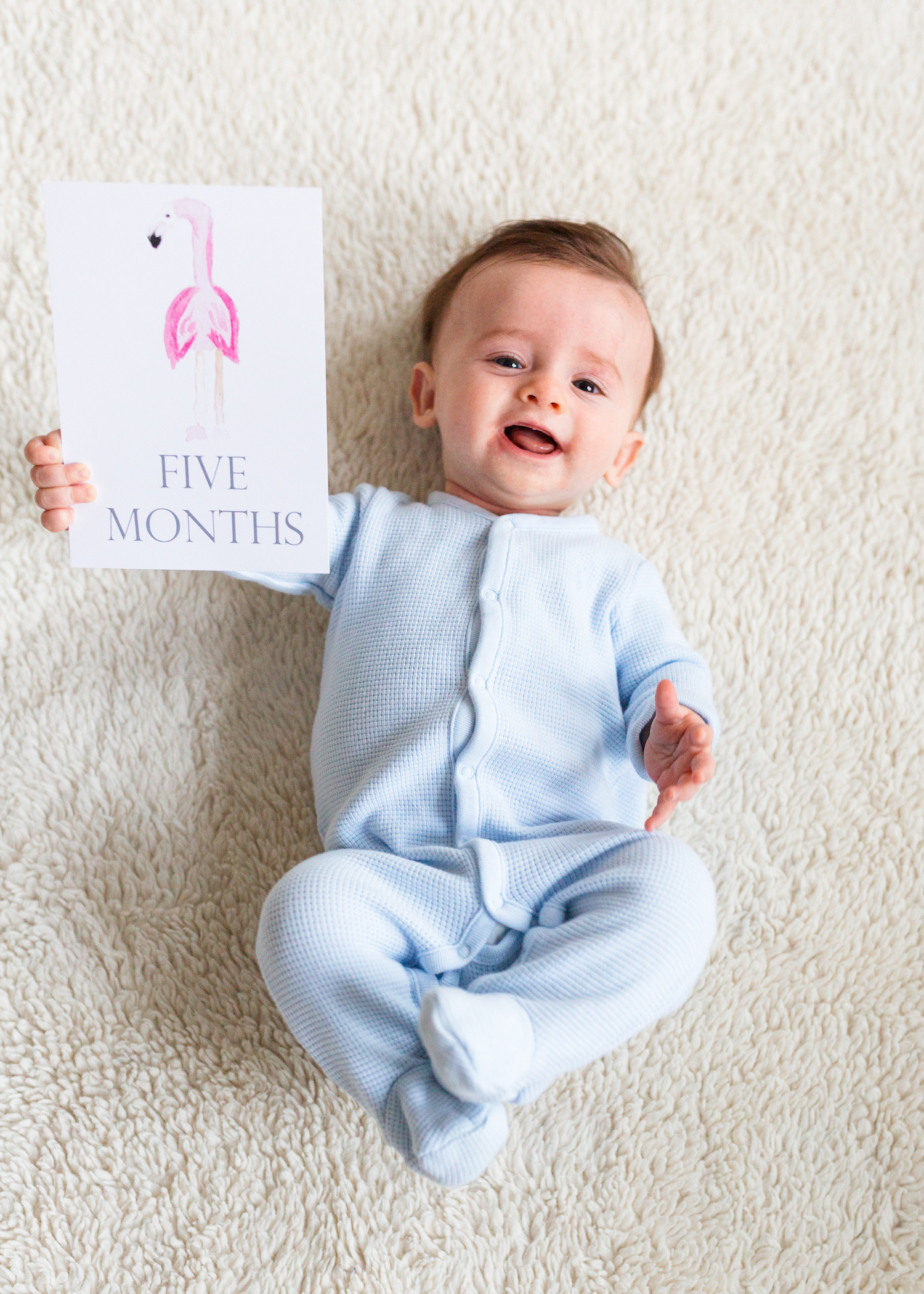 I can’t believe Teddy is five months old! Will and I were browsing through photos and videos on our flight back from Florida this weekend and couldn’t believe how tiny he used to be. There’s no question this is my favorite age so far — he’s just so playful and smiley! We started feeding him purées a couple weeks ago (at 4 1/2 months) and it brings me so much joy to watch him try something new and decide how he feels about it. We also got him to the beach and in the pool for the first time last week and as much as Teddy is Will’s twin, he could be in the water all day just like me. 🙂 I’m trying to focus on all the firsts we have ahead rather than dwelling on any of the lasts (which I talked about in this post) and this month has definitely had a lot of fun firsts.