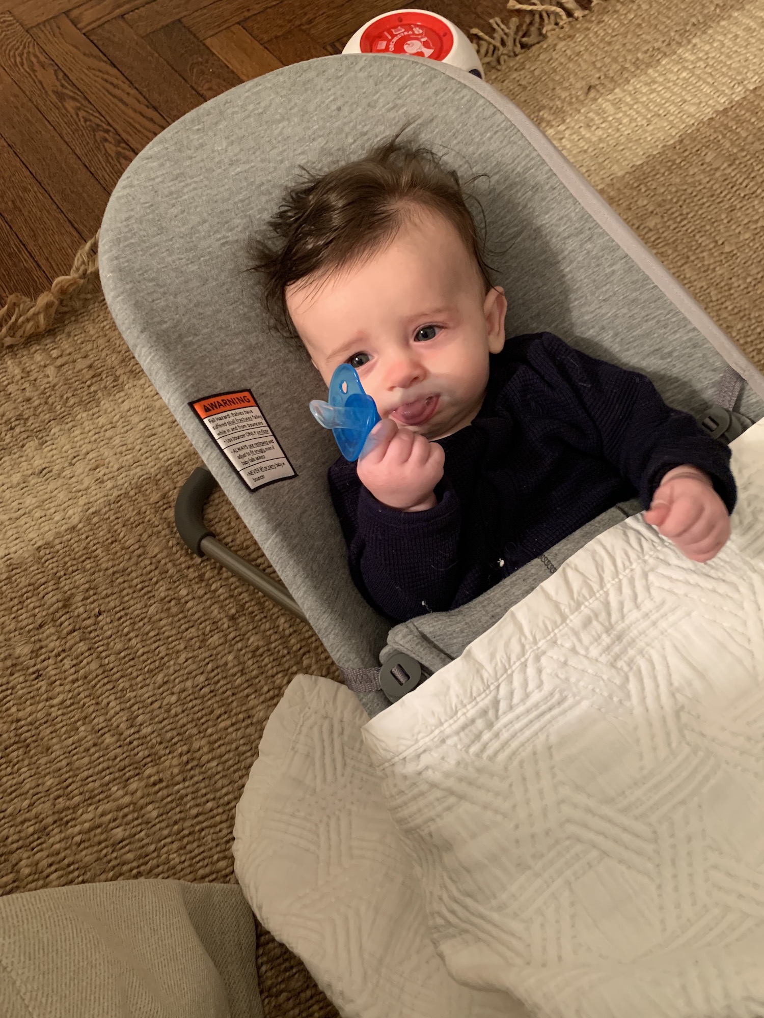 bouncer (his new favorite trick is to remove his pacifier and whine until someone puts it back in ?)