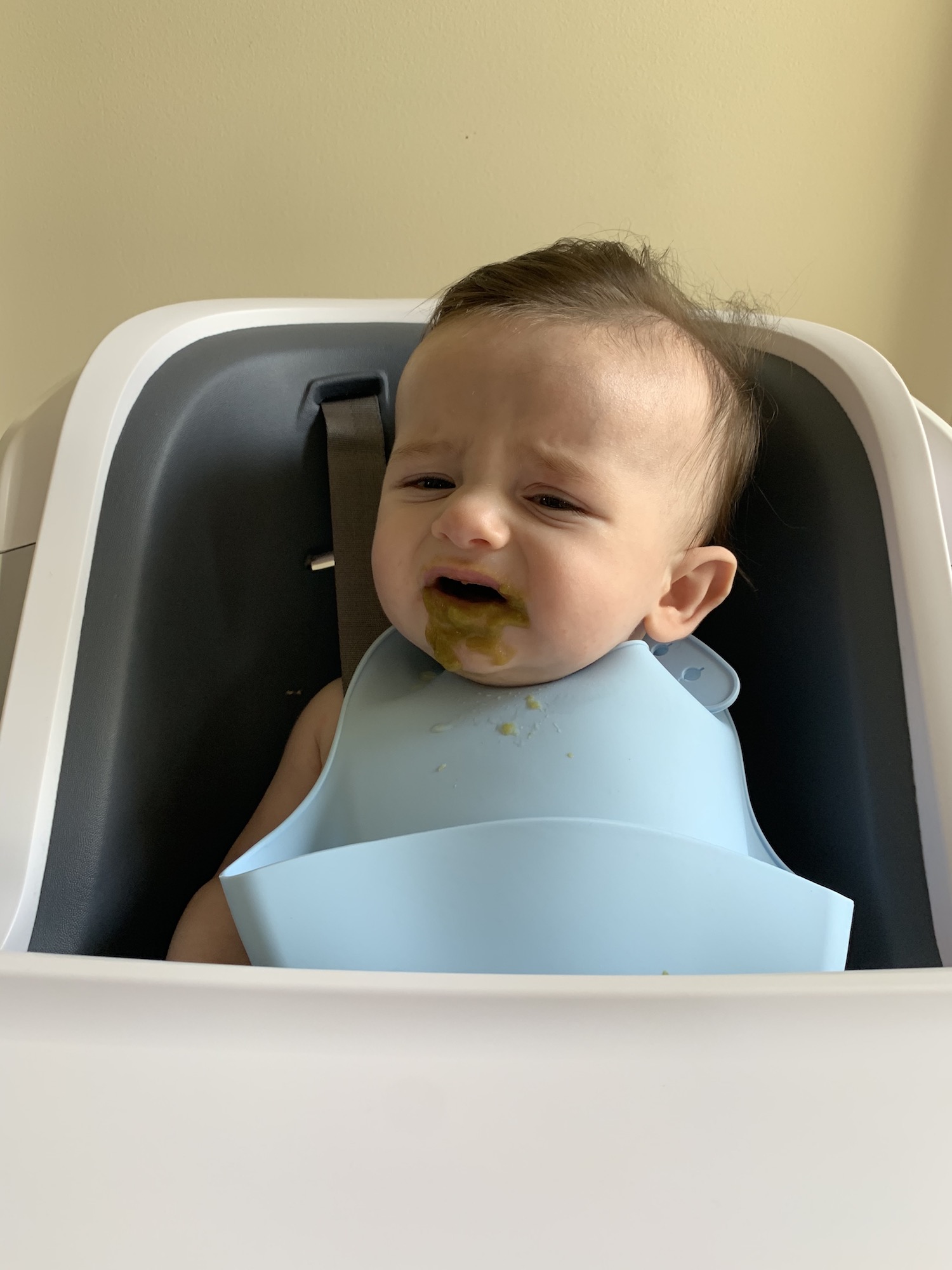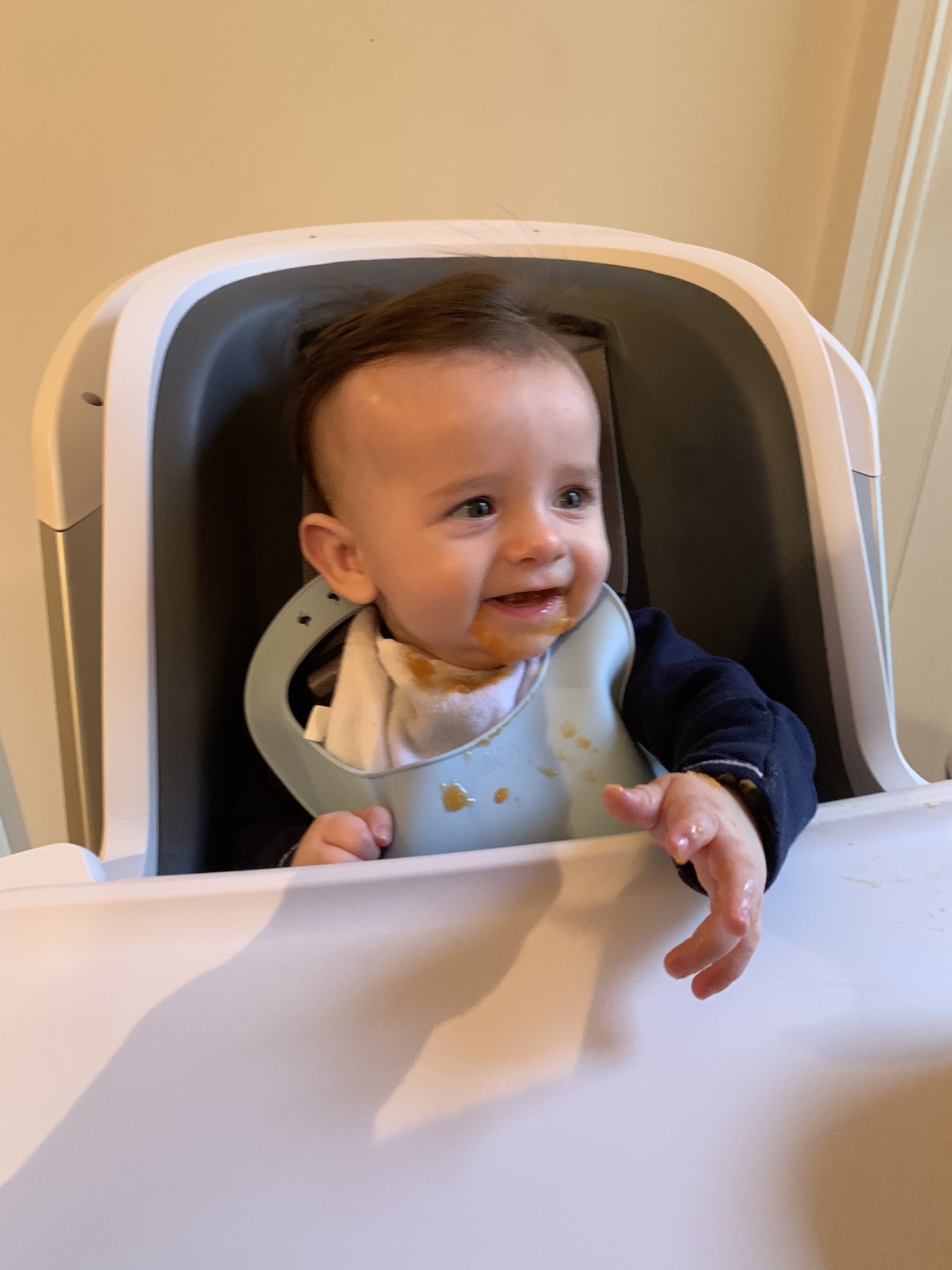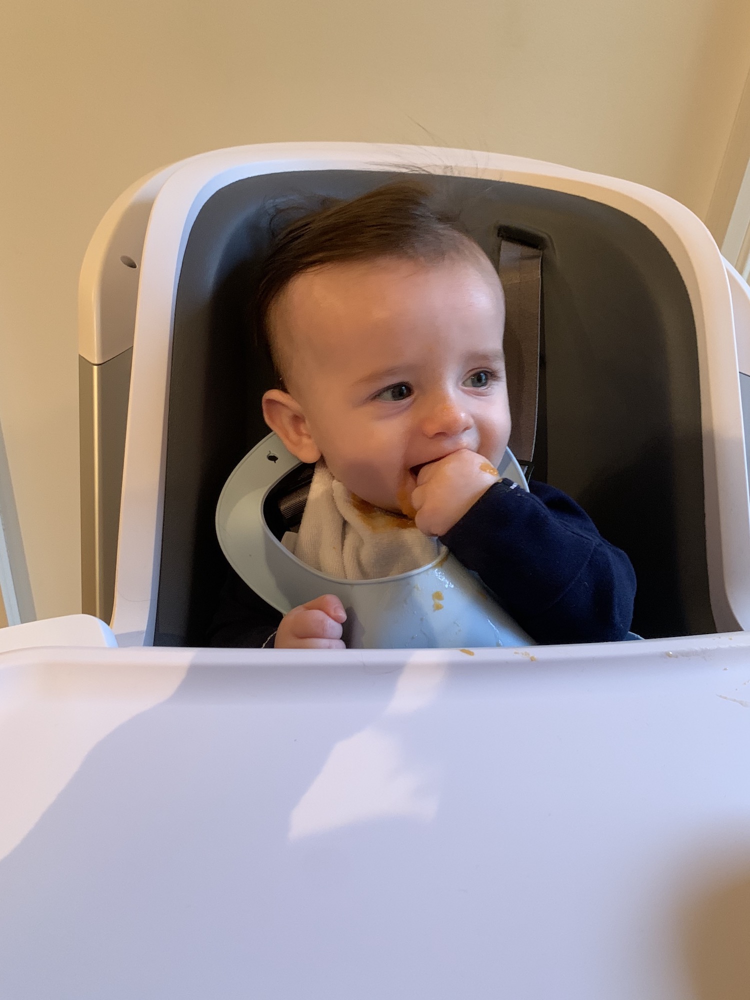 So far he’s been a fan of sweet potatoes, carrots, bananas, and pears, iffy on oatmeal and prunes, and a hard no on green beans. Our pediatrician also encouraged us to introduce peanut butter mixed with water, which he loves! I’ve found introducing solids to be a particularly frustrating topic to research online as a new parent (though I totally understand why there’s no one approach that works for every family!) so we’ve been leaning on our pediatrician for advice about what foods to introduce when. I’m still breastfeeding six times a day so we’re trying not to put any pressure on feeding him solids and just exposing him to as many flavors and textures as we can in the coming months.
