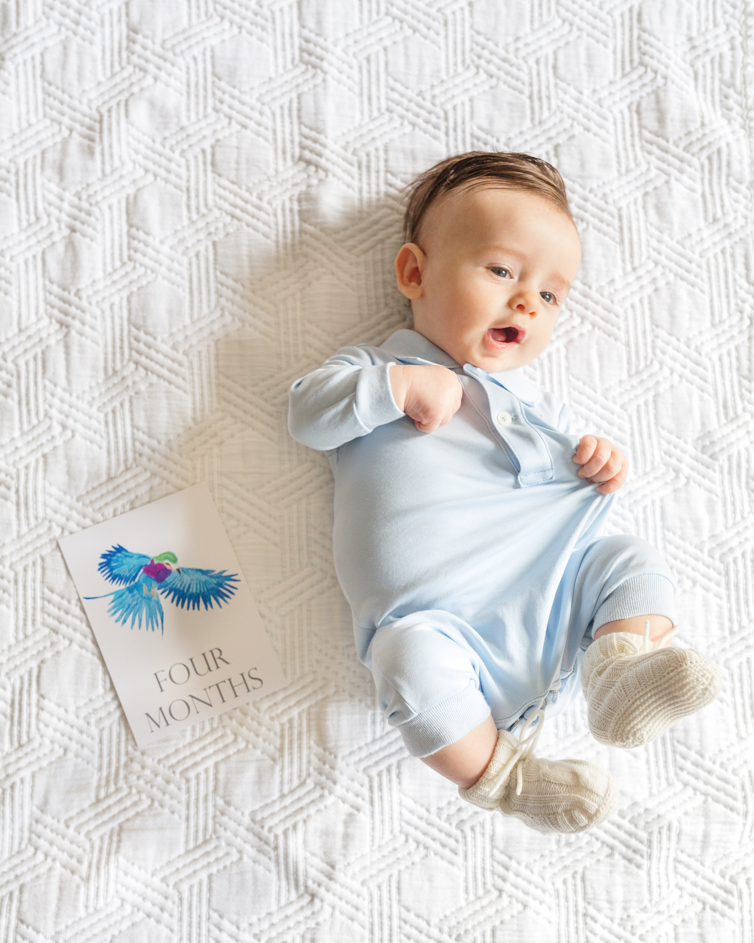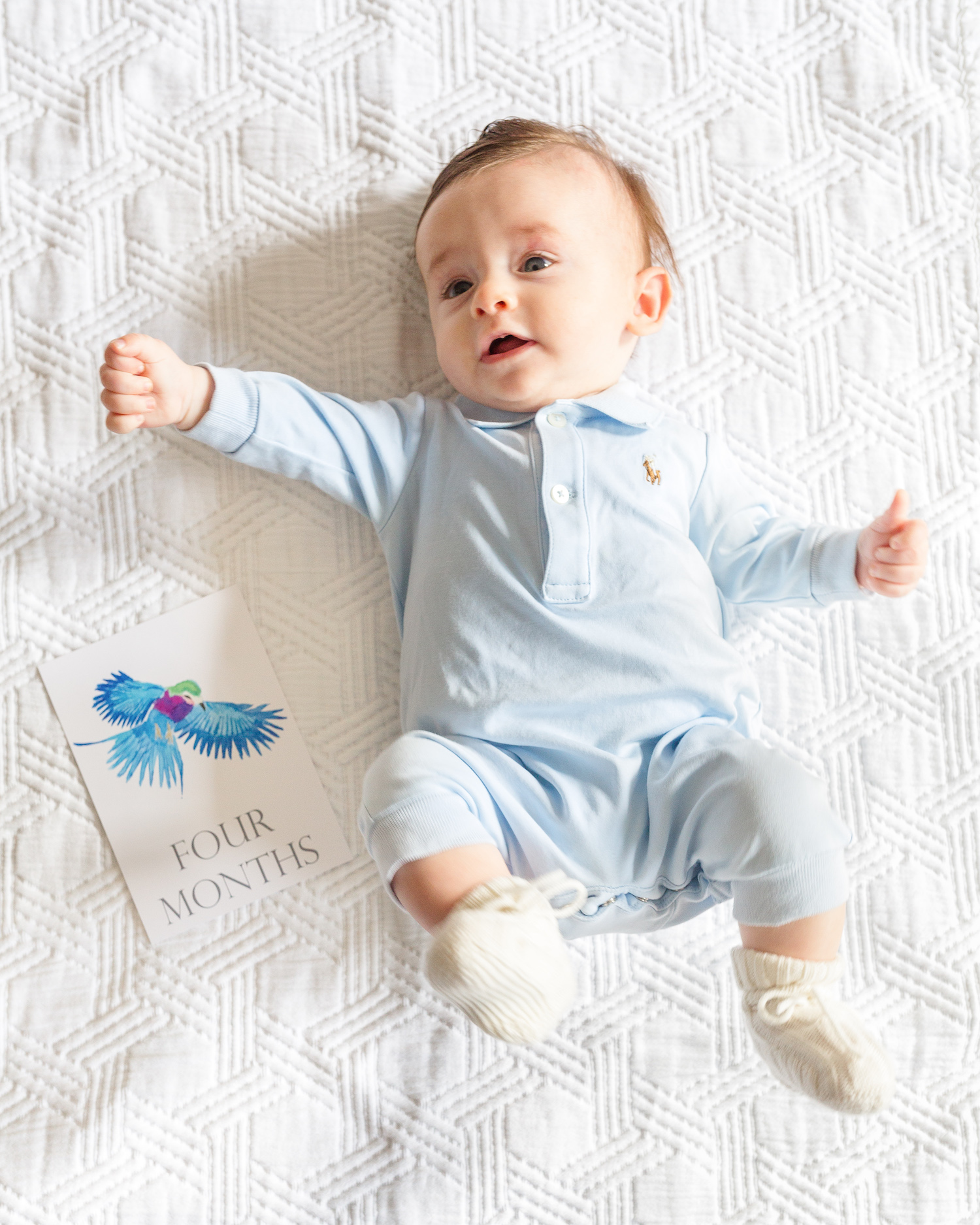 Hello from the other siiide! Yesterday marked four months since Teddy’s birthday and I have to say it feels like a milestone worth celebrating after the month we’ve had! I feel like we lost half the month between me and Will battling the flu and taking turns solo parenting to keep Teddy from getting sick. We are finally feeling healthy again and eager to get back into more of a routine. We’re also going through a major sleep regression right now but every day he wakes up with a smile on his face and I feel like the luckiest person in the world to get to be his mom. You can catch up on his birth story, my postpartum recovery, and his one month, two month, and three month updates here!