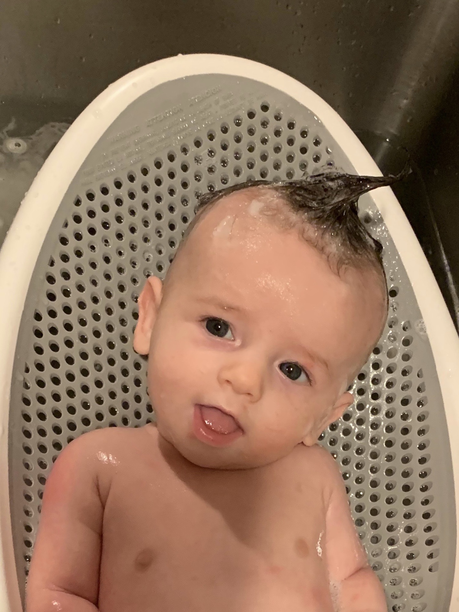 I feel like I say this every month, but it’s amazing how fast he’s grown and how much he’s learned since my three month update. He has very little interest in sitting still and wants to be propped up in a standing position for literally hours on end, jumping and squealing and putting on a show. He much prefers being upright and taking in his surroundings to being on his tummy right now, but I still try to squeeze in a few minutes on his playmat each day so he can strengthen the muscles he’ll need to crawl in a few months. He LOVES music and could stare at this music cube and this light bar for hours. We also recently introduced this jumpscape and he loves bouncing up and down and playing with all the colorful attachments. It even has a jump counter (like a Fitbit for babies!) which cracks me up.