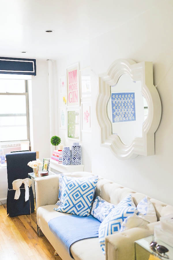 I lived in two studio apartments in New York in my early twenties and had a lot of fun trying to make the most of each space. It’s entirely possible to carve out space for sleep, work, dining, and relaxing in three or four hundred square feet! I used this large bookcase to separate my bed from my living/dining space; I arranged books on the top shelves and used baskets on the bottom shelves for extra clothes storage. I used this acrylic console as a desk — surfaces like acrylic and glass are great in small spaces because they don’t crowd the room visually. I used inexpensive pieces from IKEA like a dresser that would fit inside the closet and this round dining table and spent more on a sofa and artwork that I knew I’d be able to find a home for in future living situations. I don’t think I even had rugs in either of my apartments but if that’s important to you I’d recommend an inexpensive jute or sisal style (a few ideas linked in the question above) in case the size won’t be practical for wherever you move next. Happy decorating!