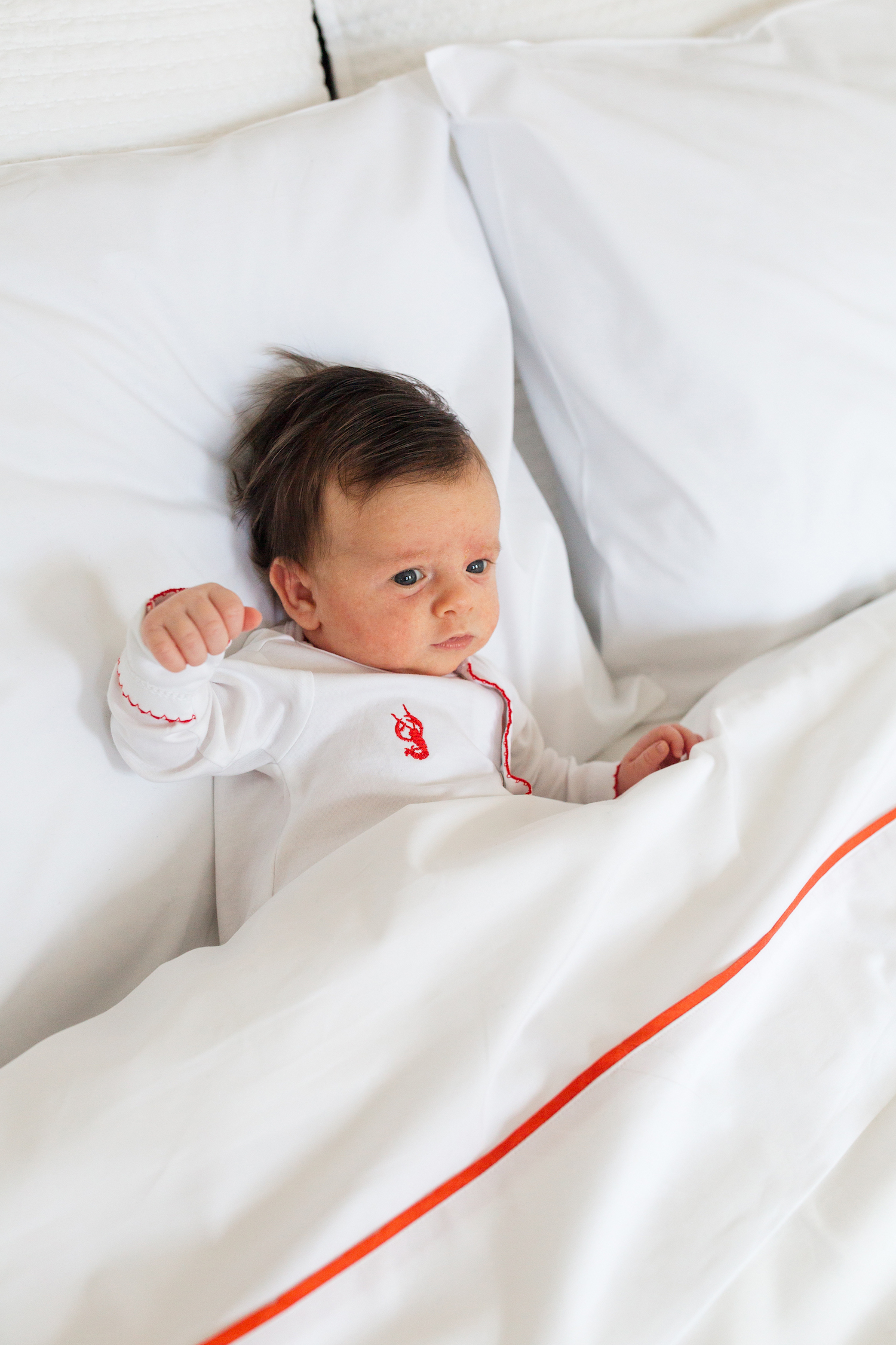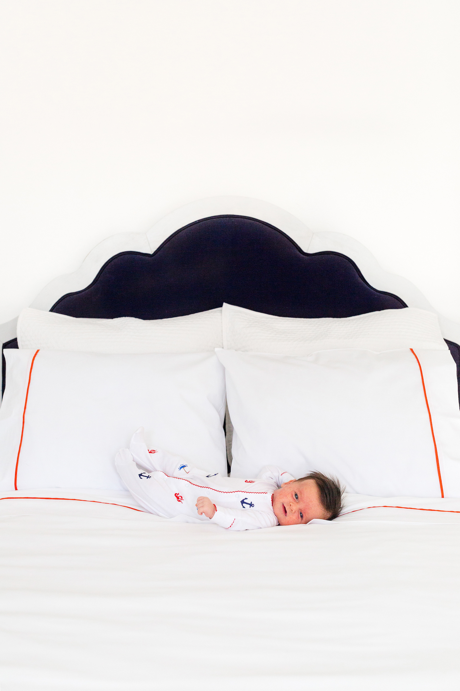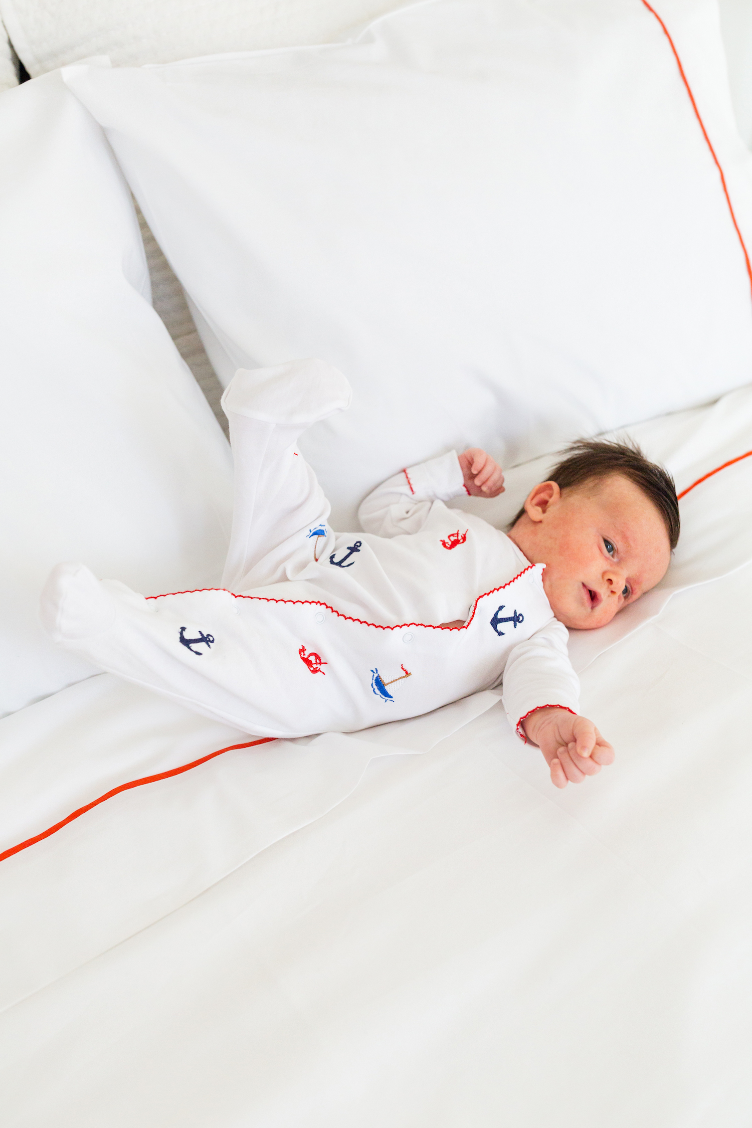 serena & lily beach club sheet set in papaya and sammy + nat nautixcal embroidered original footie romper