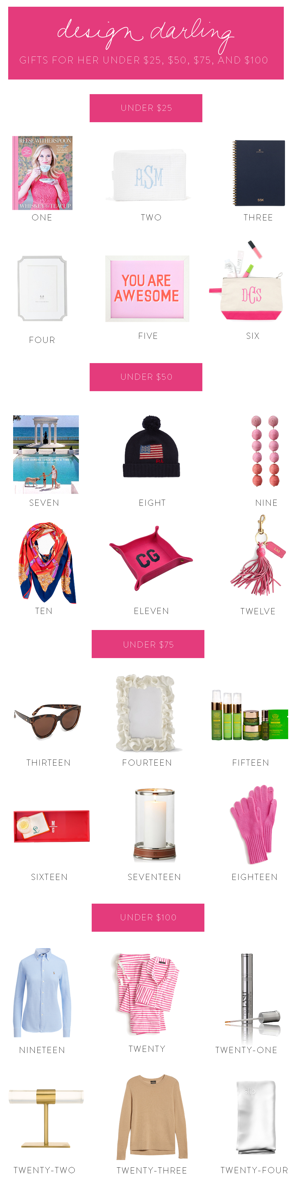 I have to say I’m extra excited about the affordable gifts in this post. I already own a few of them (this book, this picture frame, this book, this silk scarf, these sunnies, this shirt, this eyelash serum, this cashmere sweater, this silk pillowcase… oops, clearly more than a few) and I had so much fun tracking down other gift ideas at price points all under $100. Like how cute is this cosmetic case (or this one) for under $25? Or this hat for less than $50? Oooh and this super chic hurricane that you can monogram?! I would be very happy to see any of these under our tree this year!