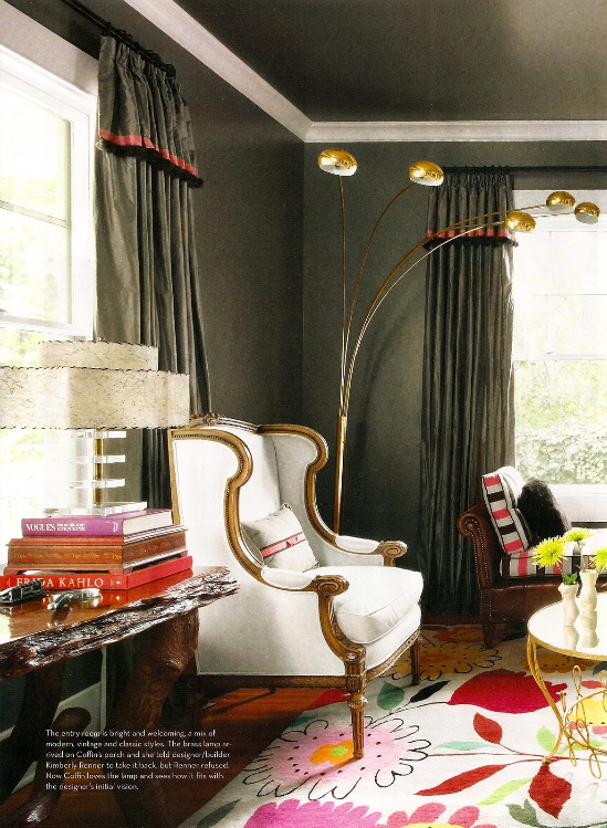 How pretty are these cool gray walls paired with warm pinks and reds? It’s an unexpected combination that works wonders in libraries and living rooms alike. Add in some bright white upholstery and a sparkly chandelier and I could move right in!