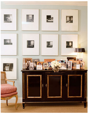 While I appreciate those who can live with asymmetry, this type A personality much prefers symmetrical alignment for frames, furniture, you name it. The graphic impact of a matching frames — be it two or twenty — is so strong that I can’t imagine doing it any other way. How do you prefer your gallery walls?