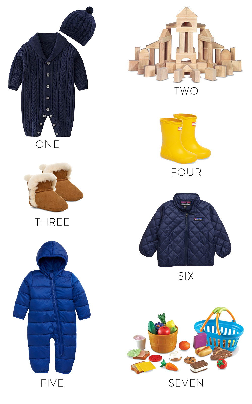 I love this sweater onesie on Teddy which we pair with these precious little Ugg boots! I know he would also love this play food set or these wooden blocks.