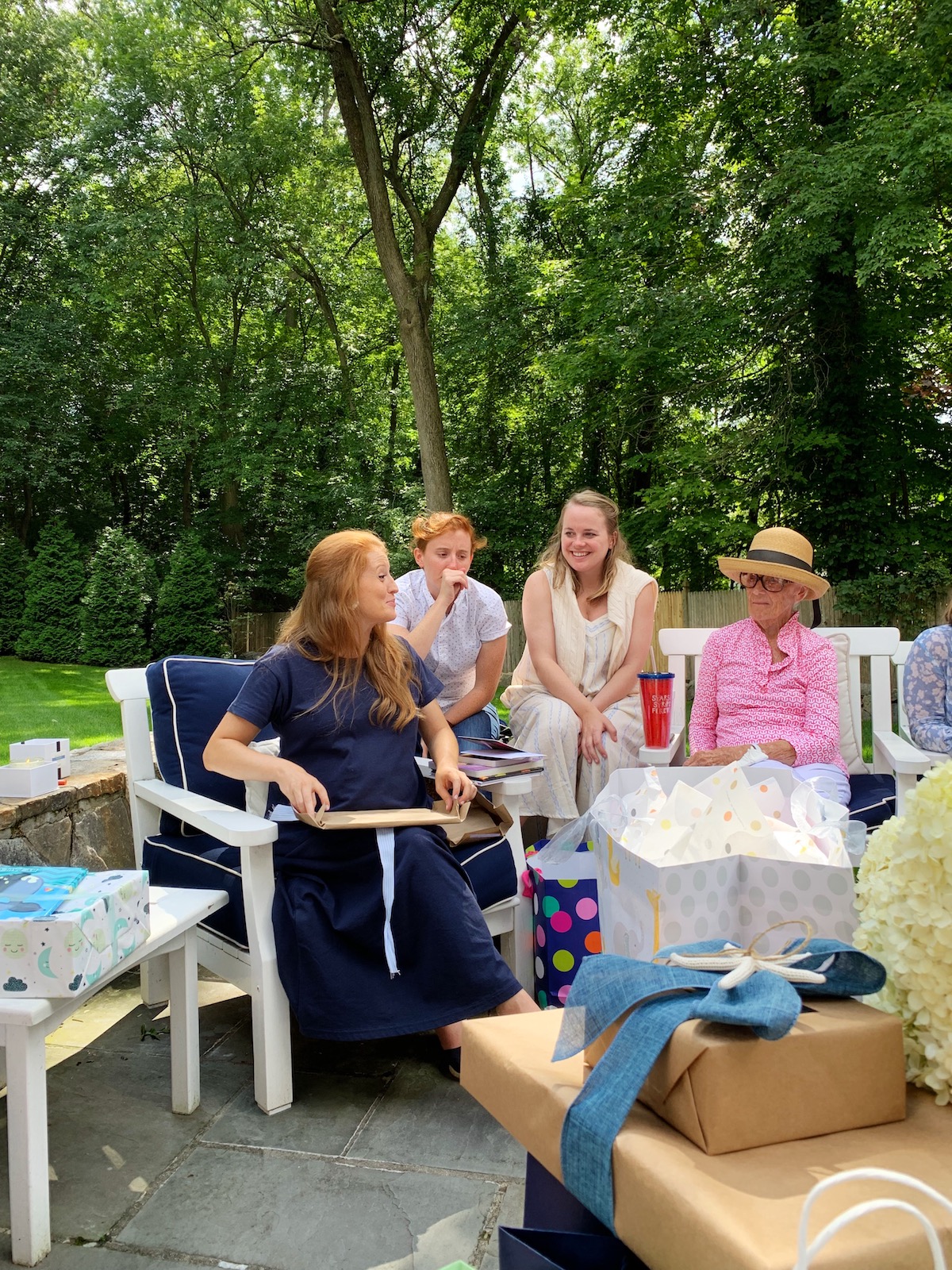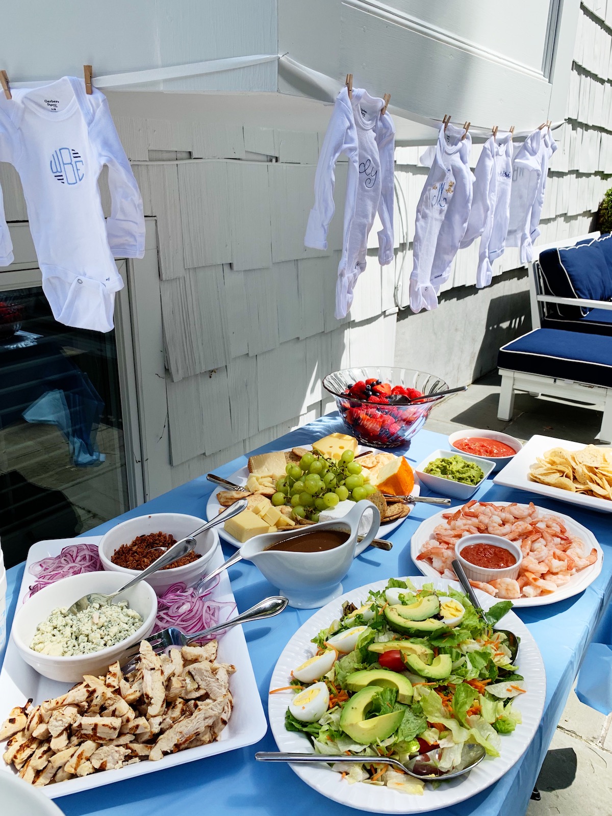 Ali and Emily ordered a big tray of my favorite Cobb salad from Rory’s and set up lots of apps in my parents’ backyard. The display of onesies made me tear up! Ali had her friend Kate embroider each of them and it’s safe to say baby boy’s closet is well-stocked with monograms! I won’t be sharing the baby’s name on the blog until he arrives but you can see his initials on the onesie on the left. 😉