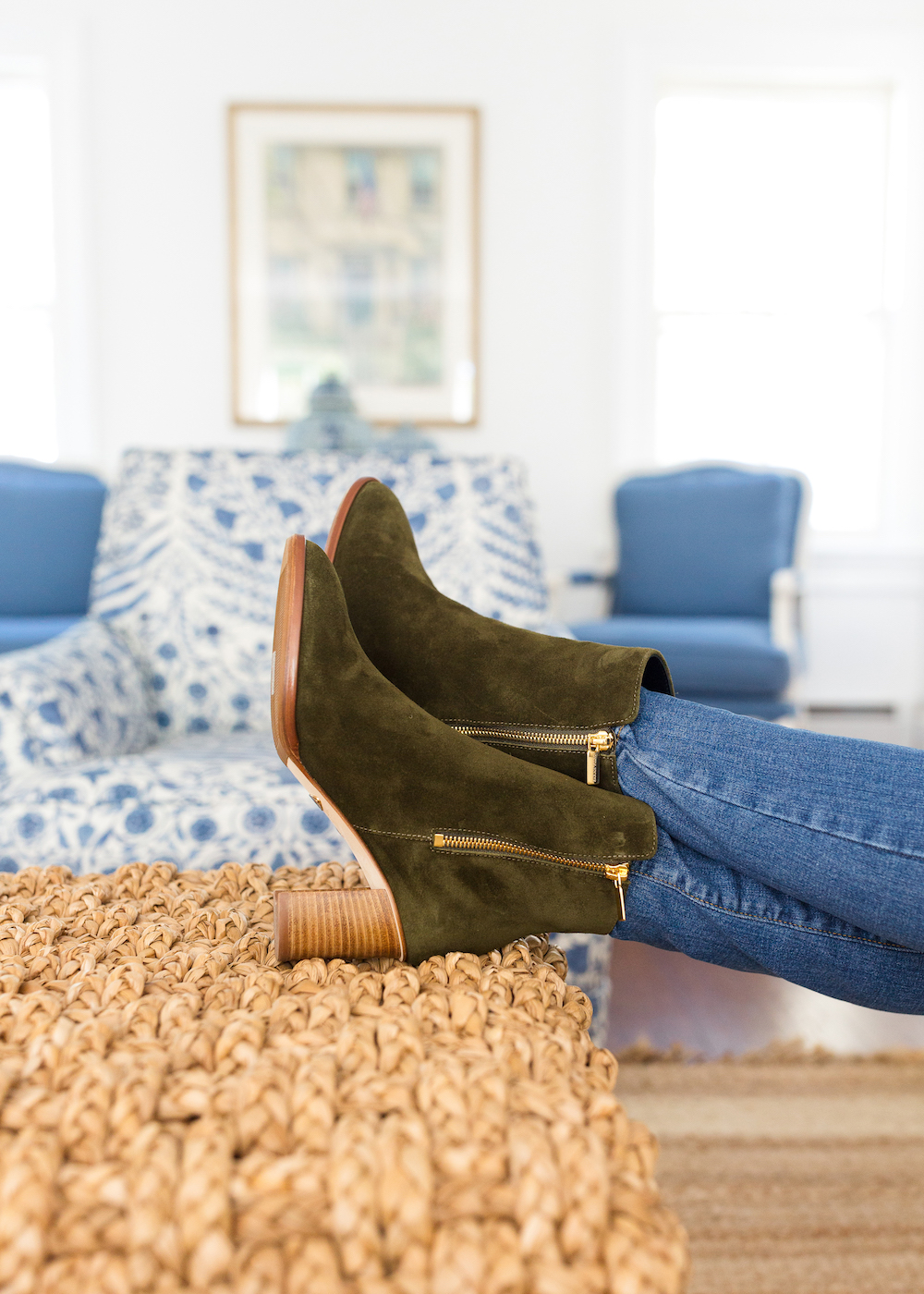 I can’t believe tomorrow is September 1! It’s been quite hot in Connecticut but the leaves in our backyard are already starting to turn and it’s got me shifting my attention to all things fall. I’m determined to give ourselves things to look forward to no matter what the world throws our way this season — apple picking, Teddy’s first birthday, little projects around the house, etc.! And my first pair of fall boots just arrived which always gets me excited for the change in seasons. I’ve fallen in love with several of Sarah Flint’s shoes this past year but these suede booties may very well take the cake. The silhouette reminds me of a pair I wore into the ground (starting on our honeymoon!) but in a fun olive green hue and with zippers that make them so much easier to get on and off!