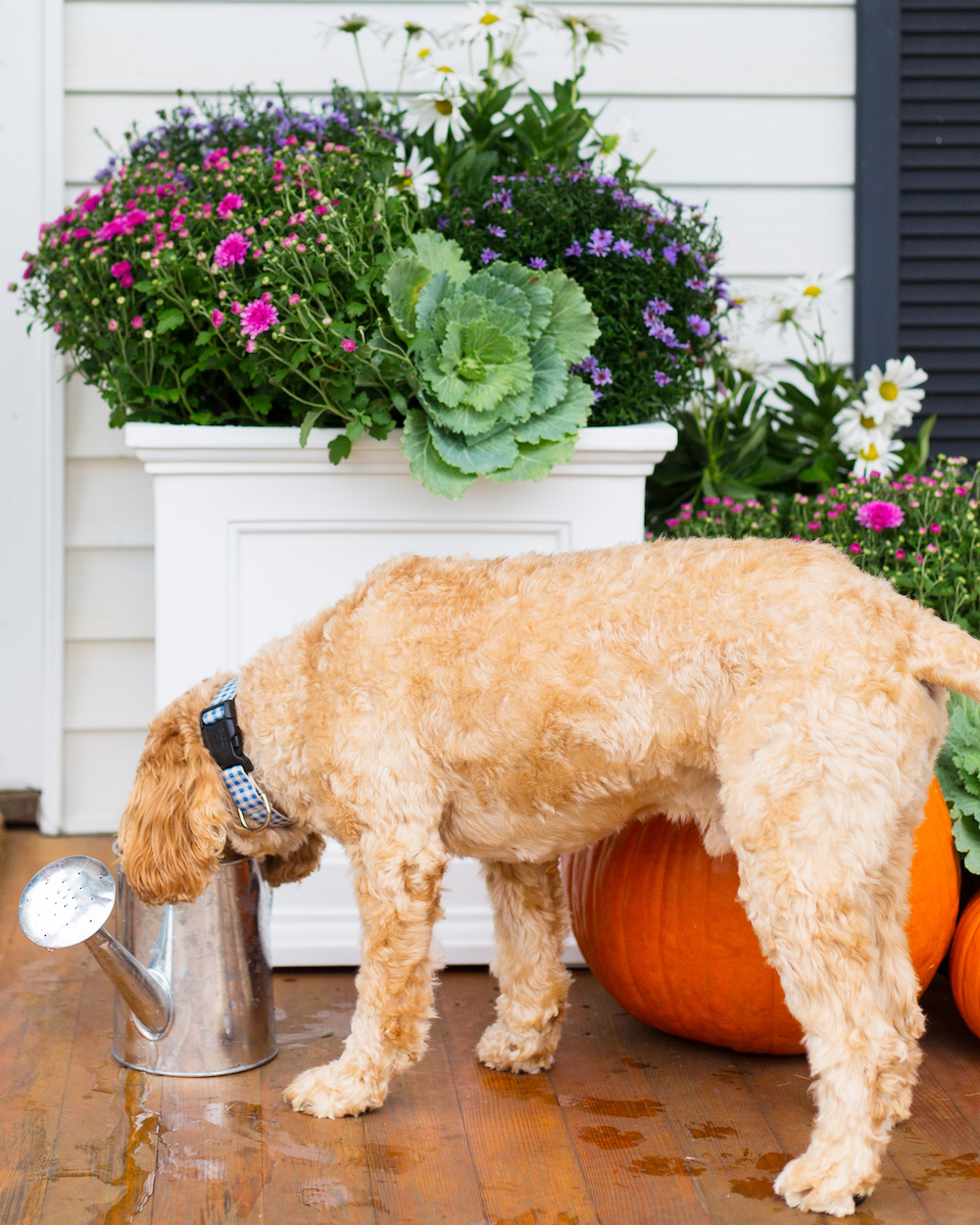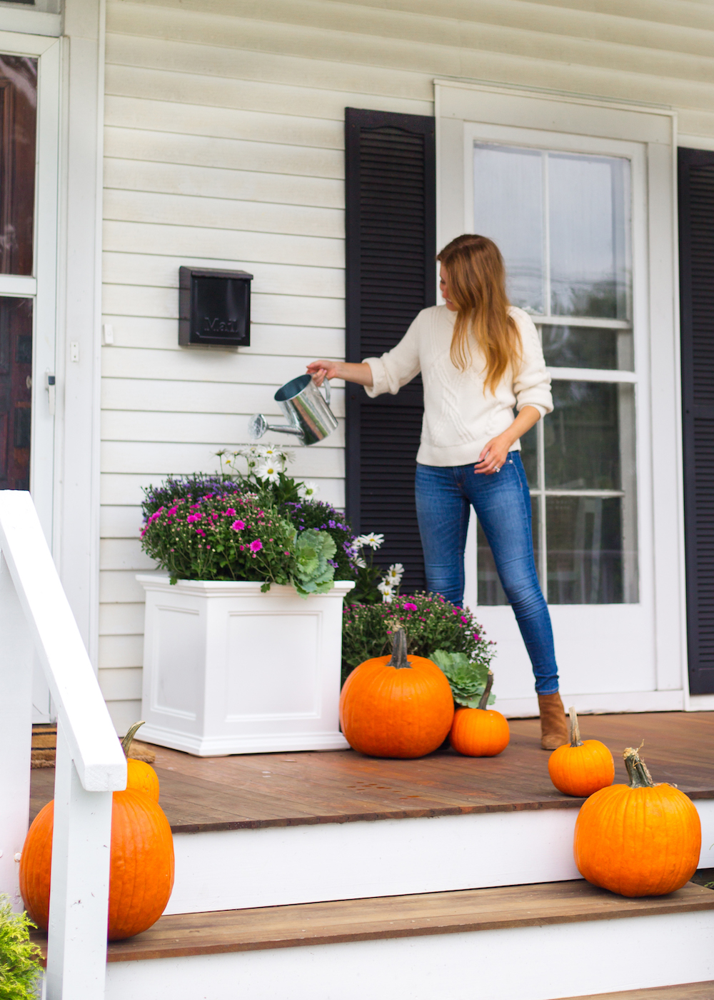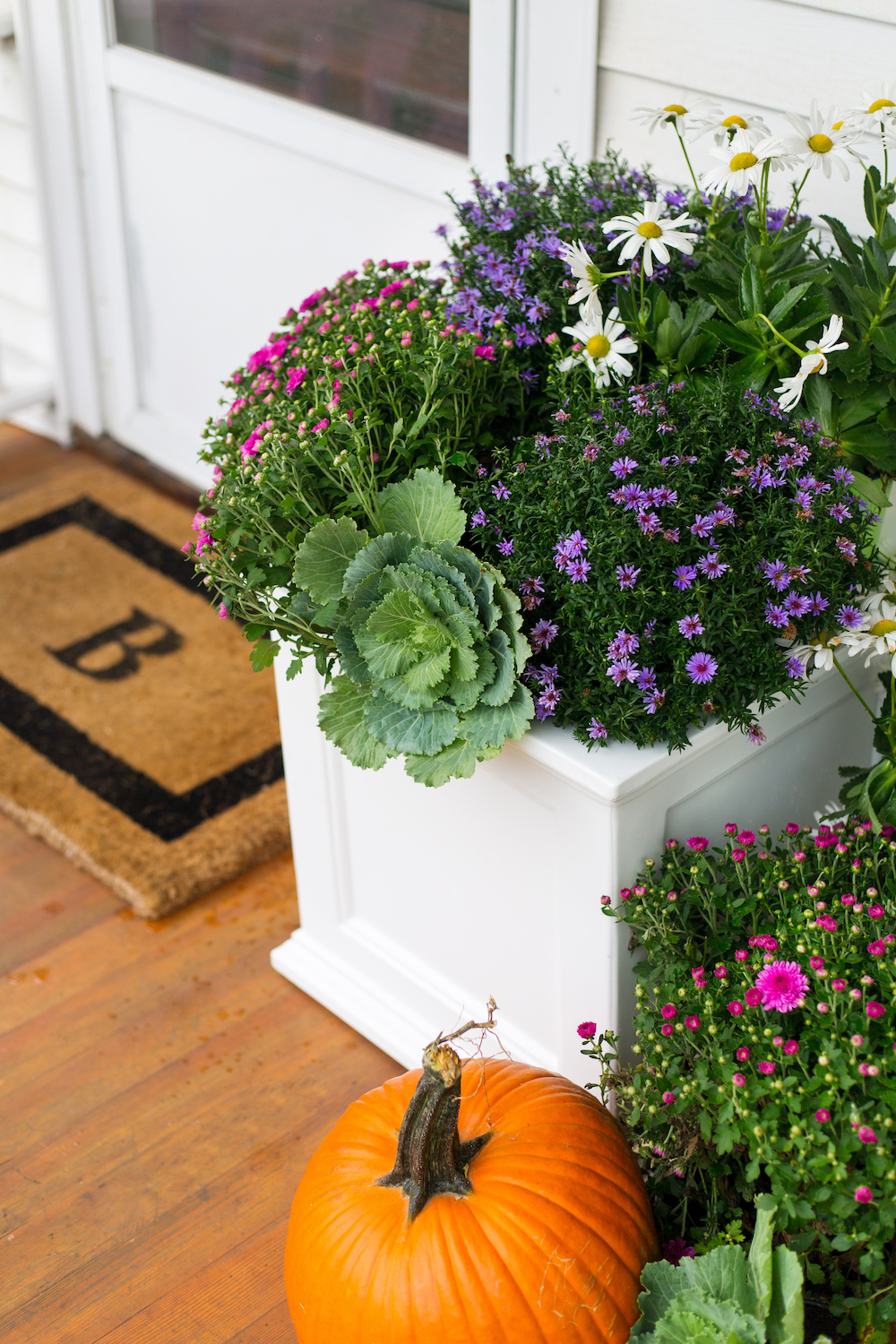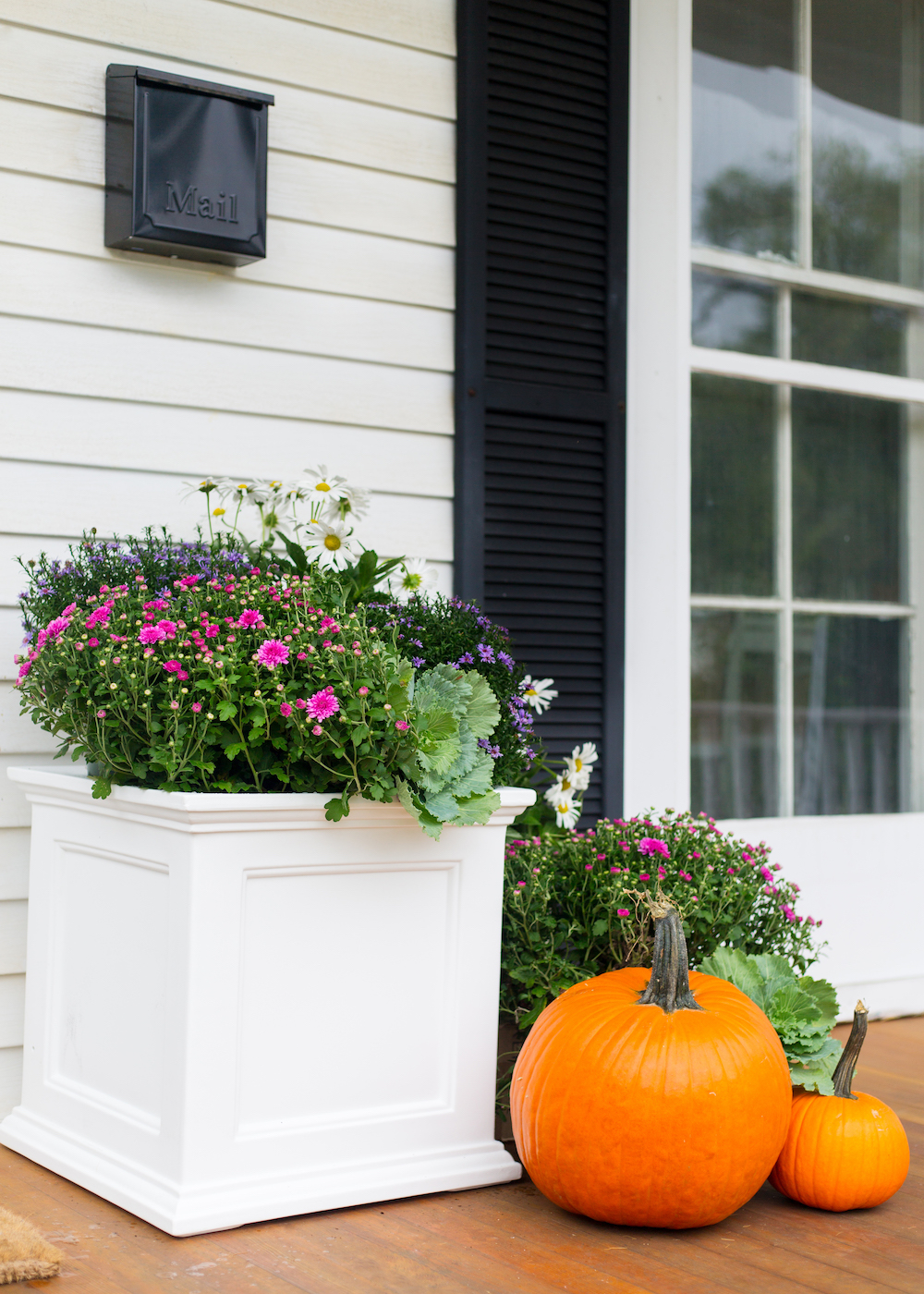 I found this classic white planter on their site and immediately envisioned it filled with colorful mums and surrounded by pumpkins on our porch. My mom (ever the green thumb in our family) convinced me to add daisies and a couple cabbage plants and I love the way it turned out! I’m also fully obsessed with this chippendale planter but it was just a little too small for the space I wanted to fill so I have it saved in my eBay watch list for a future outdoor project!