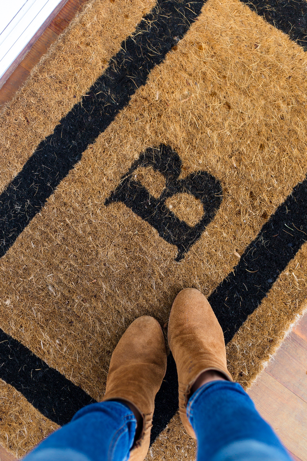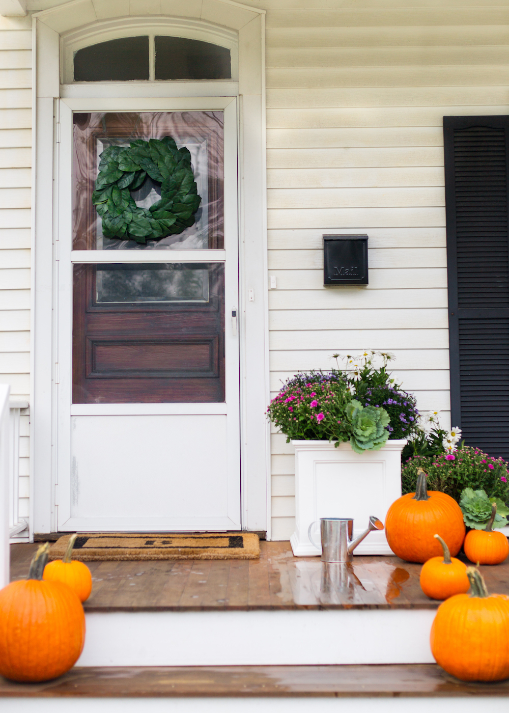 Our monogrammed doormat was one of my first purchases after our wedding but eBay has tons of similar options at all different price points (like this, this, and this). I also scooped up this faux magnolia wreath and this metal watering can when I ordered the planter and I feel like they complete the look! Funny story: when I put the watering can down on the porch and went back inside for my camera, I came back out to see Rory lapping up the water in the can and dripping it all over the porch, hence the damp wood and puppy pawprints in some of these pictures!