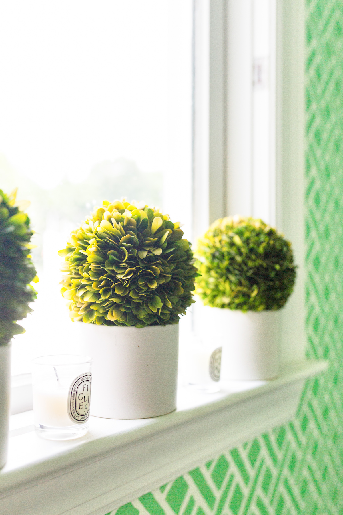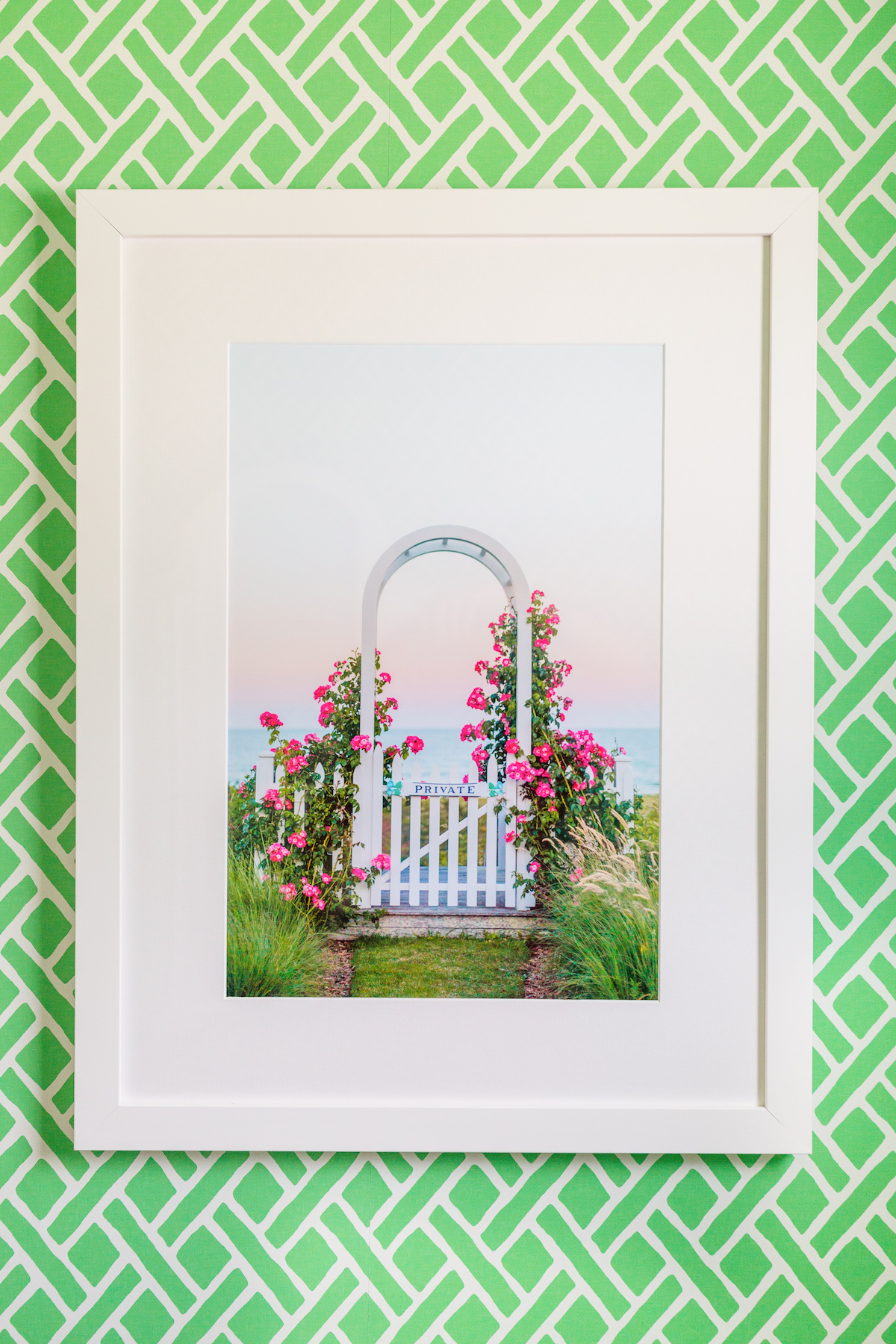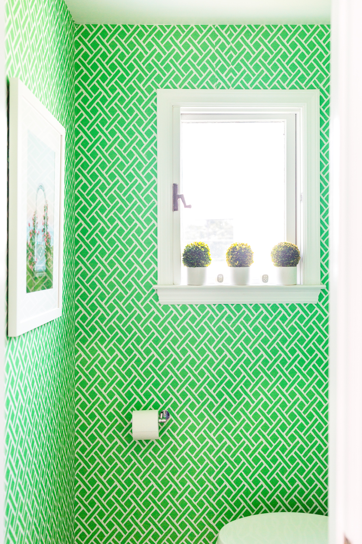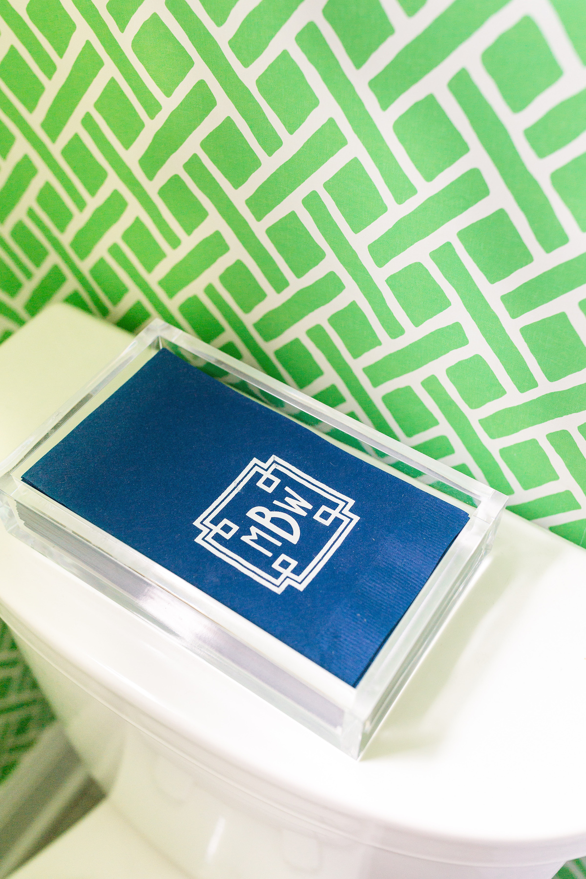 I shared a ton of fun peel and stick wallpaper options in this post and my mom convinced me to go a little outside my very-blue-and-white comfort zone with this green trellis print. It is so bright and happy and it made me smile every time I walked in! Like I said in a perfect world I would have loved to add a coordinating appliqué monogram to the sink skirt and order monogrammed napkins to match the green walls, but there’s always next time. I’m excited to hang this Nantucket Print Shop print in our next place too!