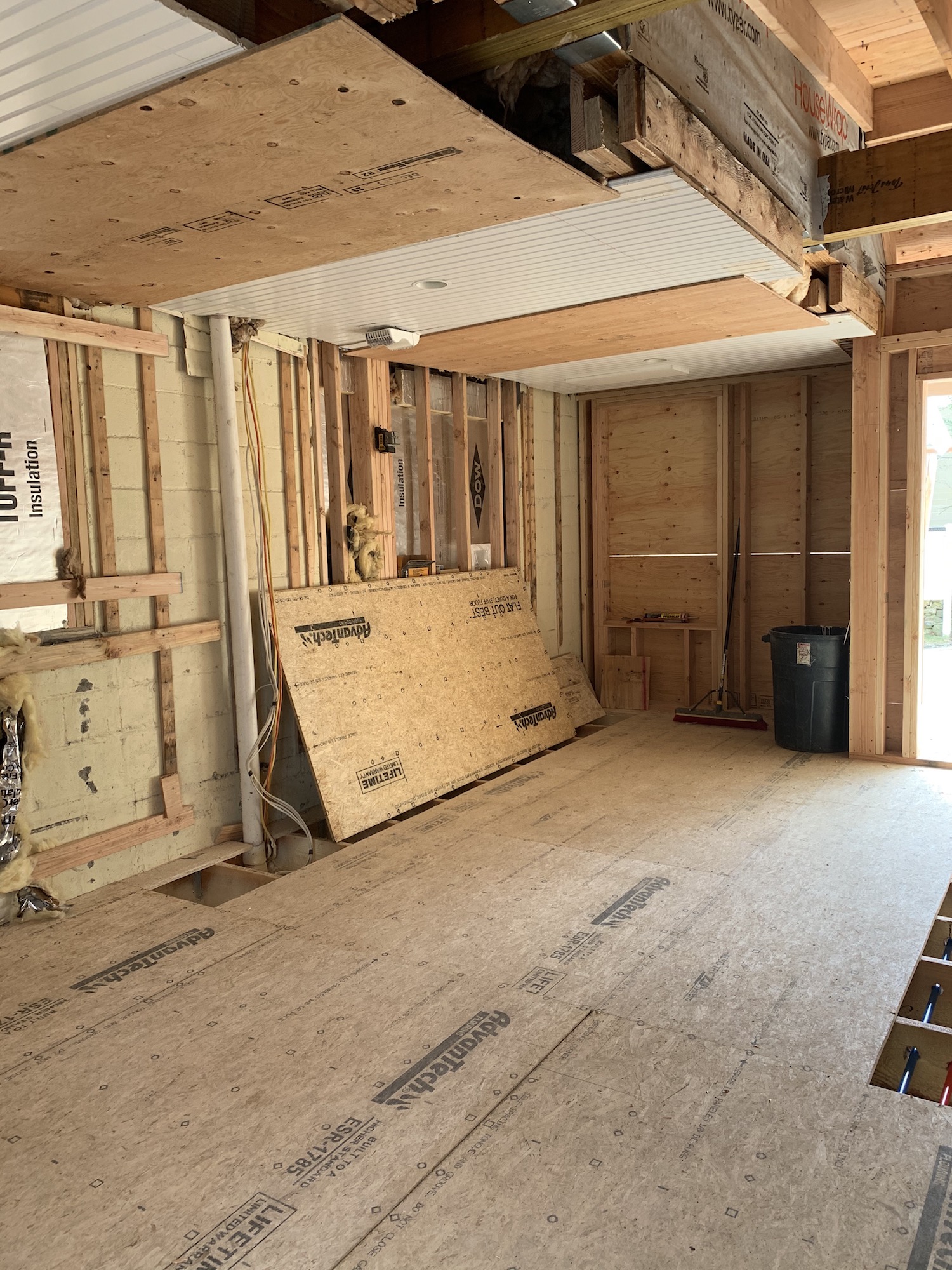 Next the windows were hung in the loft above the garage and I think they surpassed all of our expectations for how roomy this space could feel. The shed dormer will give my parents so much more liveable space (see more on why they’re moving in with us here!) and the wall of windows under the dormered roof makes the whole room feel so light and bright. Now that all the framing is complete and windows are in, they’ve started electrical and plumbing for the bathroom.