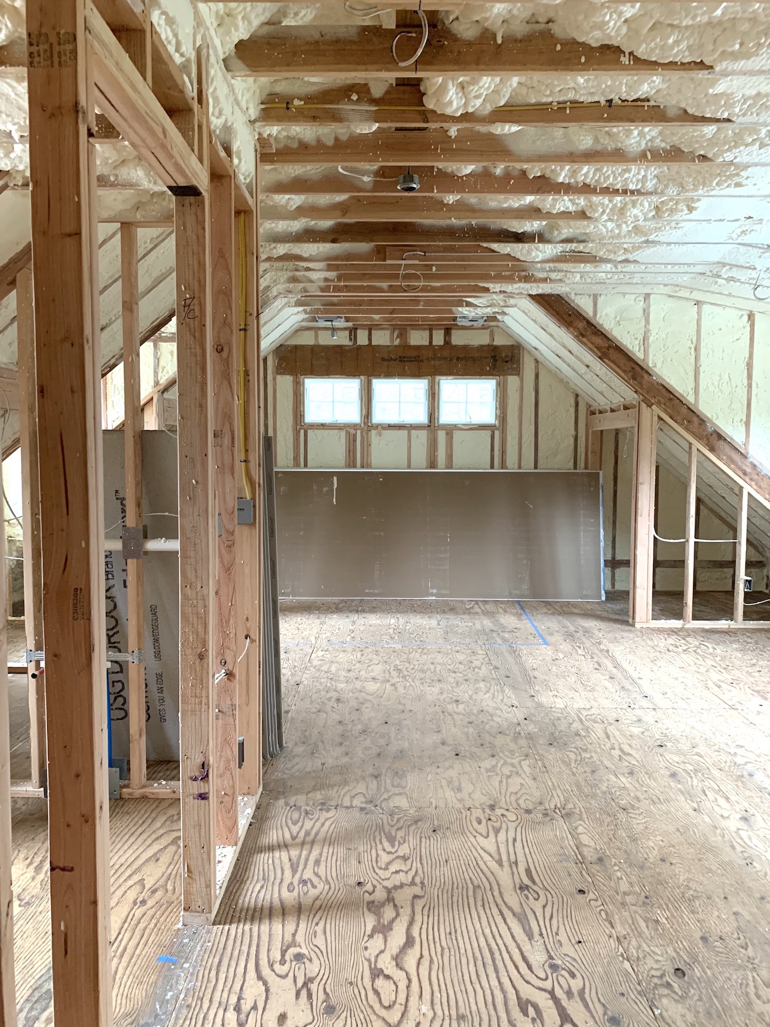 While each construction zone is totally sealed off from the part of the house we’re living in, we stayed at my parents’ house down the street (the ABC girls have been home since March 12) for a few days after the insulation went in just to be safe. You can see the shower in my parents’ future loft space taking shape above!