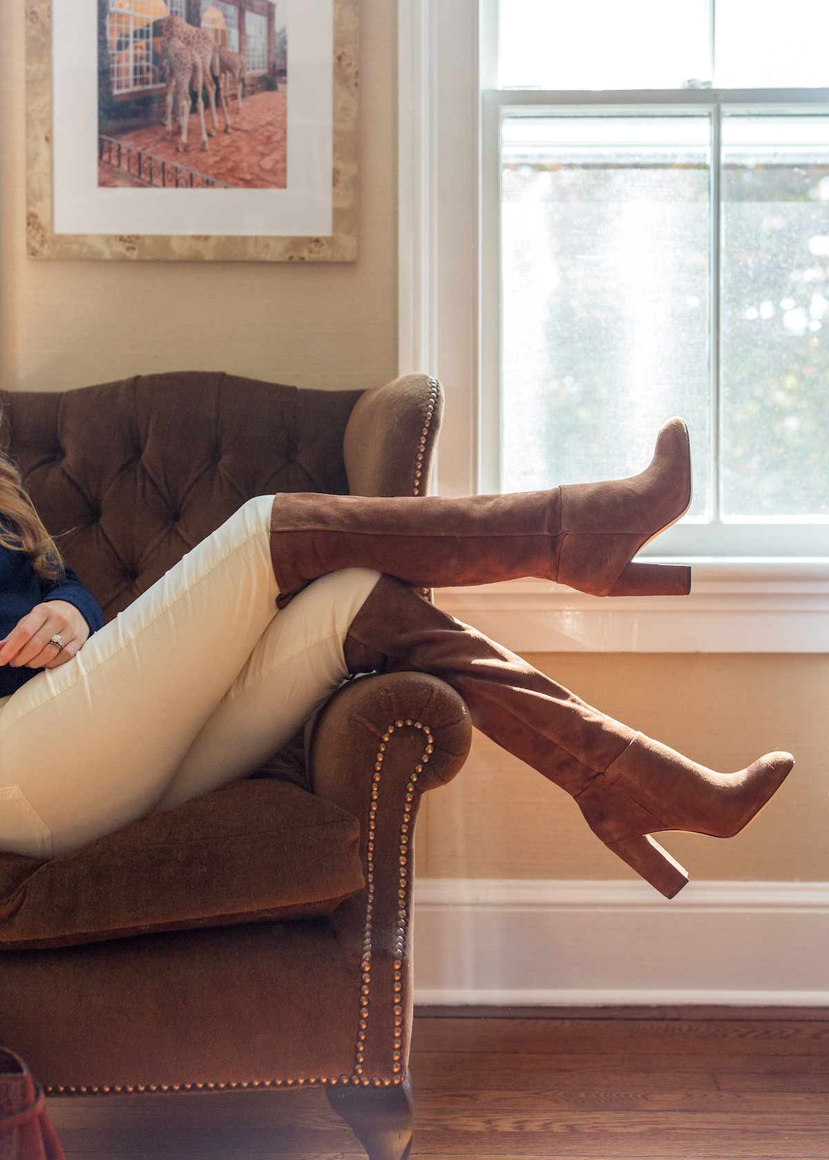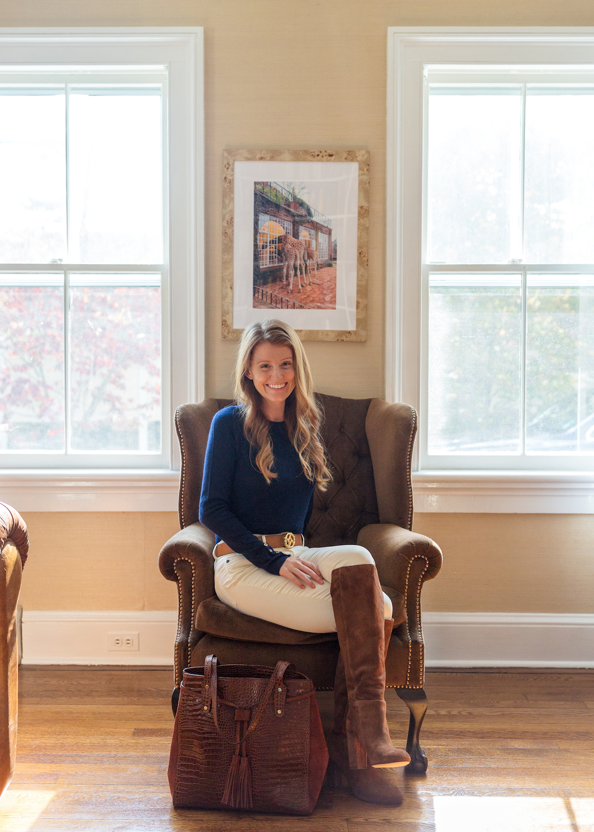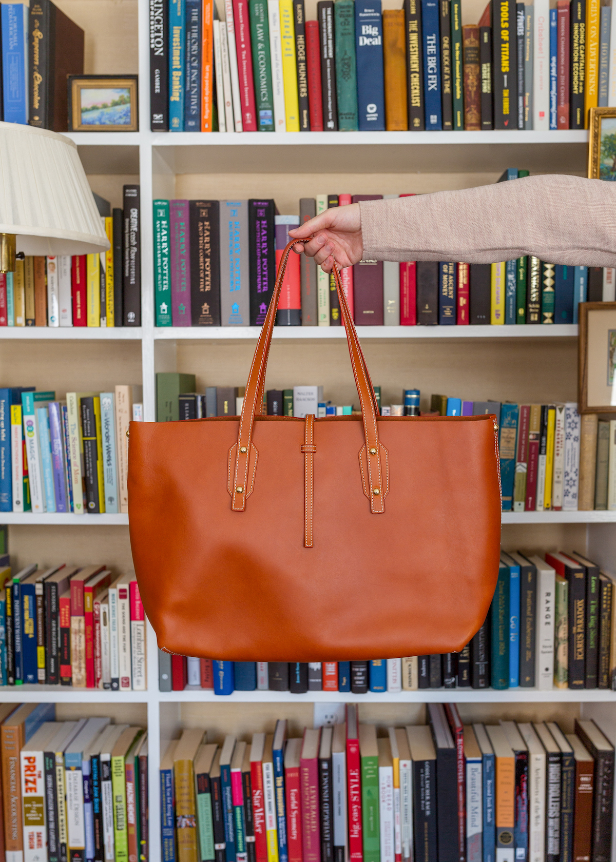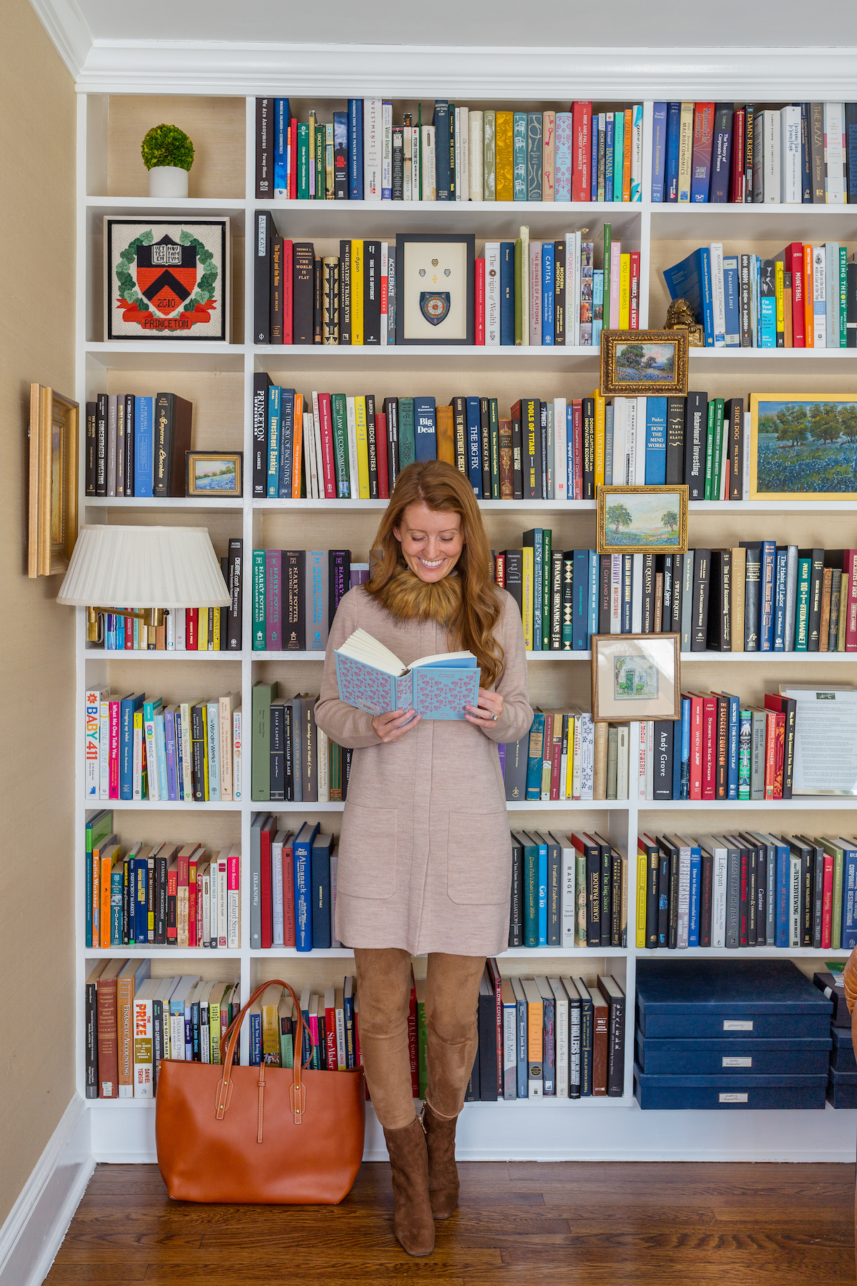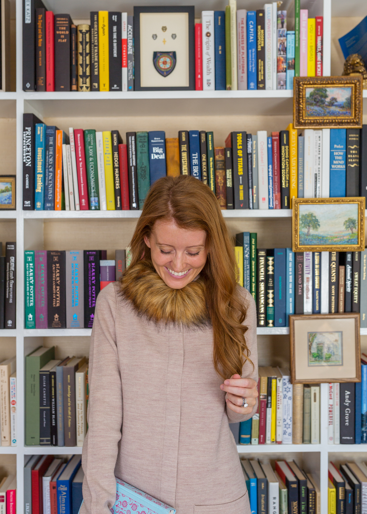 Aren’t these photos so fun? We snapped them in our-library-turned-Will’s-home-office and I don’t know why we haven’t thought to shoot in there before! I’m hoping we can get a few missing pieces sorted out so I can shoot a full room reveal in here in the next couple months because it’s such a special space! But on to the outfit… This long cardigan with the detachable faux fur collar could work for any number of occasions, from work calls to holiday dinners. I’m wearing it with these faux suede leggings that are basically as comfortable as workout leggings but infinitely chicer (just be sure to size down!). These suede booties are the perfect shade of brown and I love that they have a zipper for getting them on and off easily. And last but definitely not least, this bag! If you’re looking for a leather tote that will fit a laptop and all your essentials, seriously look no further! It has a detachable zip pouch on the interior but the rest is completely open and roomy enough for anything you need for work or would be great as a carry-on item when we’re all able to travel again. I love the classic shape and simple tab closure!
