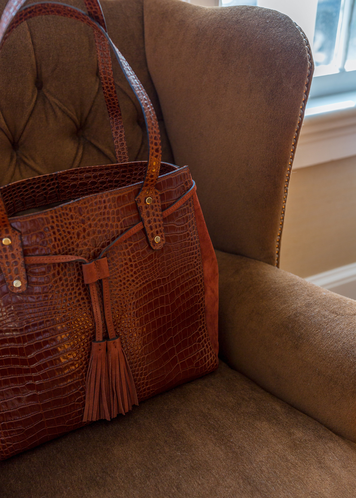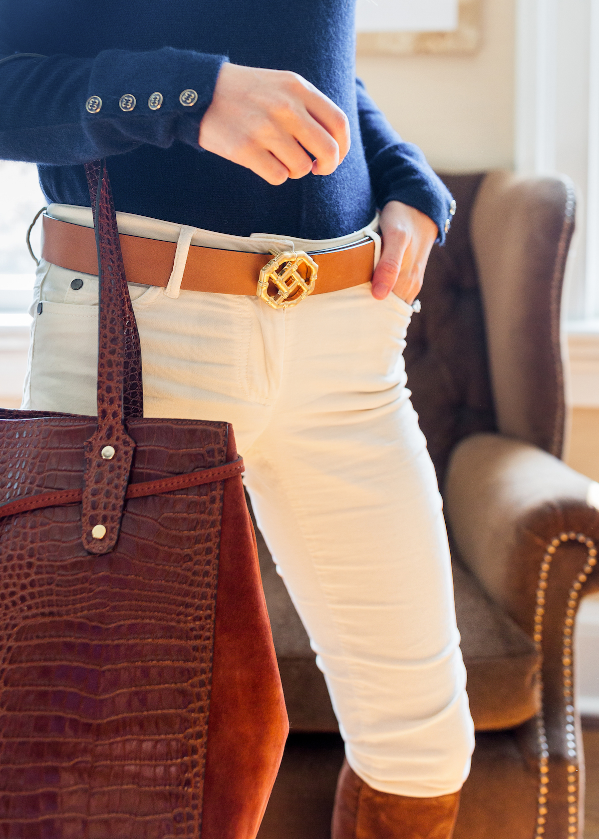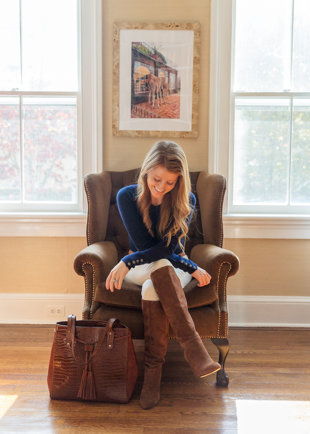This is the first cashmere sweater I’ve owned from J.McLaughlin and I can promise it won’t be the last. The quality is amazing and how sweet are the little buttons on the sleeves? It’s nicely fitted so you can wear it either over jeans or tucked into a skirt or high-waisted denim. Here I tucked it into these cool velvet jeans with this natural leather belt (I already have the navy version but I know I’ll get a lot of use out of the neutral!). And the embossed croc and suede handbag is such a timeless piece for fall. But the highlight of this outfit is for sure these perfect suede boots — I am just in love! The rich brown color is to die for and they’re incredibly flattering (leg-lengthening!) on. Highly recommend if you’re searching for a classic fall boot!