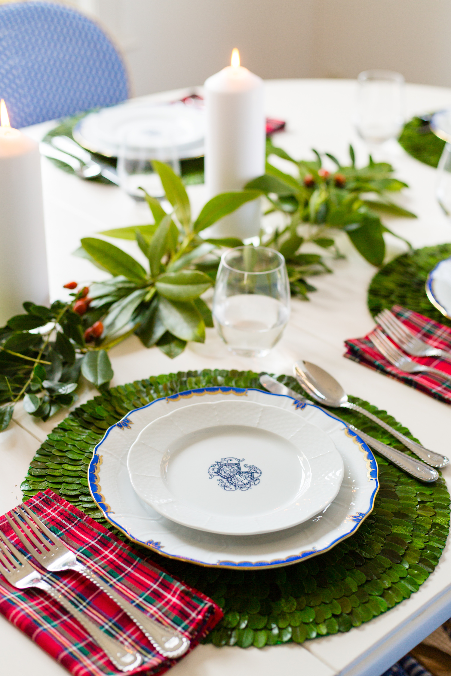 We started with a set of their monogrammed salad plates which are decorated by hand and fired in a kiln at the Sasha Nicholas studio in St. Louis. They recommended pairing them with these Herend dinner plates and I love how they look together. The plaid napkins are a fun, festive touch — I was named after a Scottish tartan so I’m a big believer that you can’t go wrong with a pop of plaid! I had never seen boxwood placemats before and I am seriously in love with these — I have boxwood topiaries in nearly every room of our house so these might be my favorite of all!