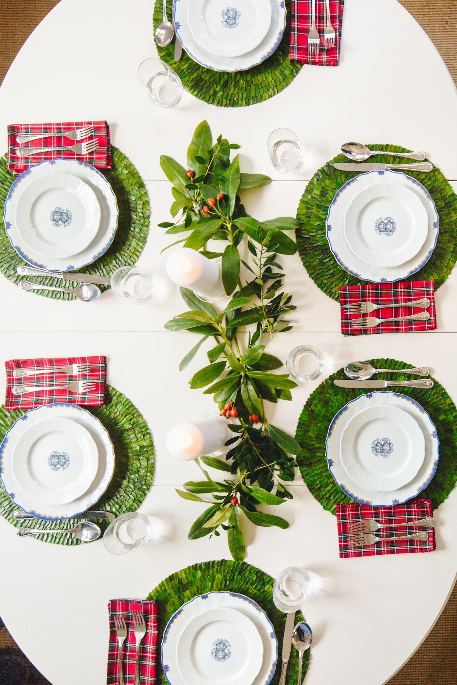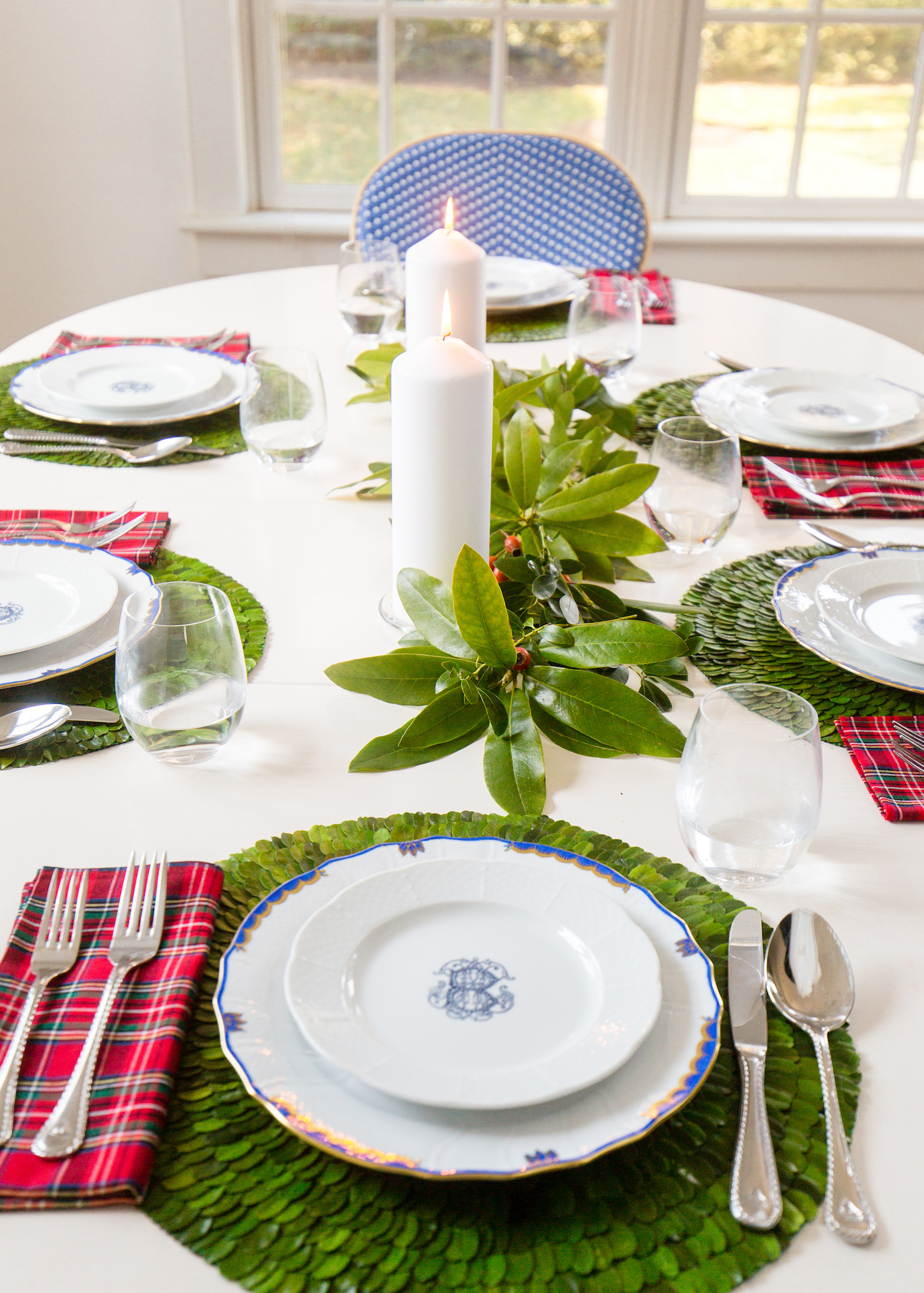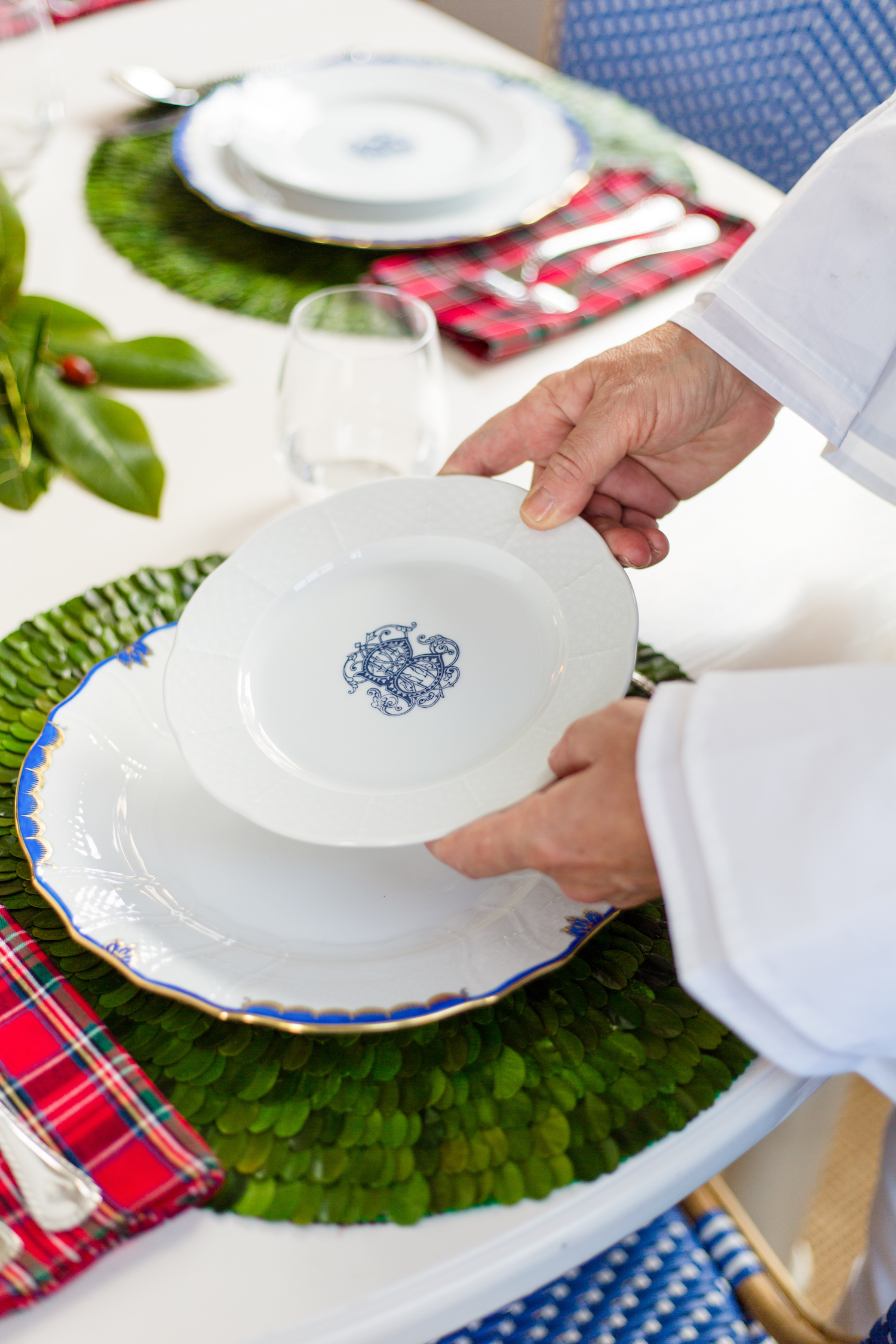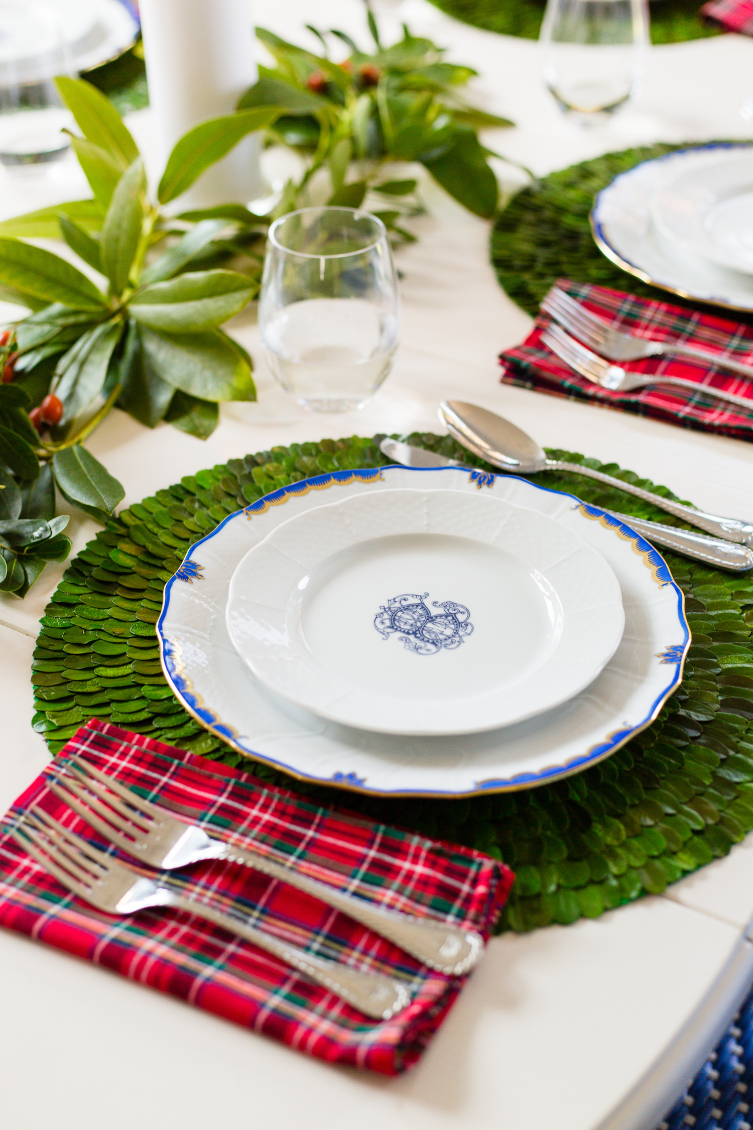 We started with a set of their monogrammed salad plates which are decorated by hand and fired in a kiln at the Sasha Nicholas studio in St. Louis. They recommended pairing them with these Herend dinner plates and I love how they look together. The plaid napkins are a fun, festive touch — I was named after a Scottish tartan so I’m a big believer that you can’t go wrong with a pop of plaid! I had never seen boxwood placemats before and I am seriously  in love with these — I have boxwood topiaries in nearly every room of our house so these might be my favorite of all!