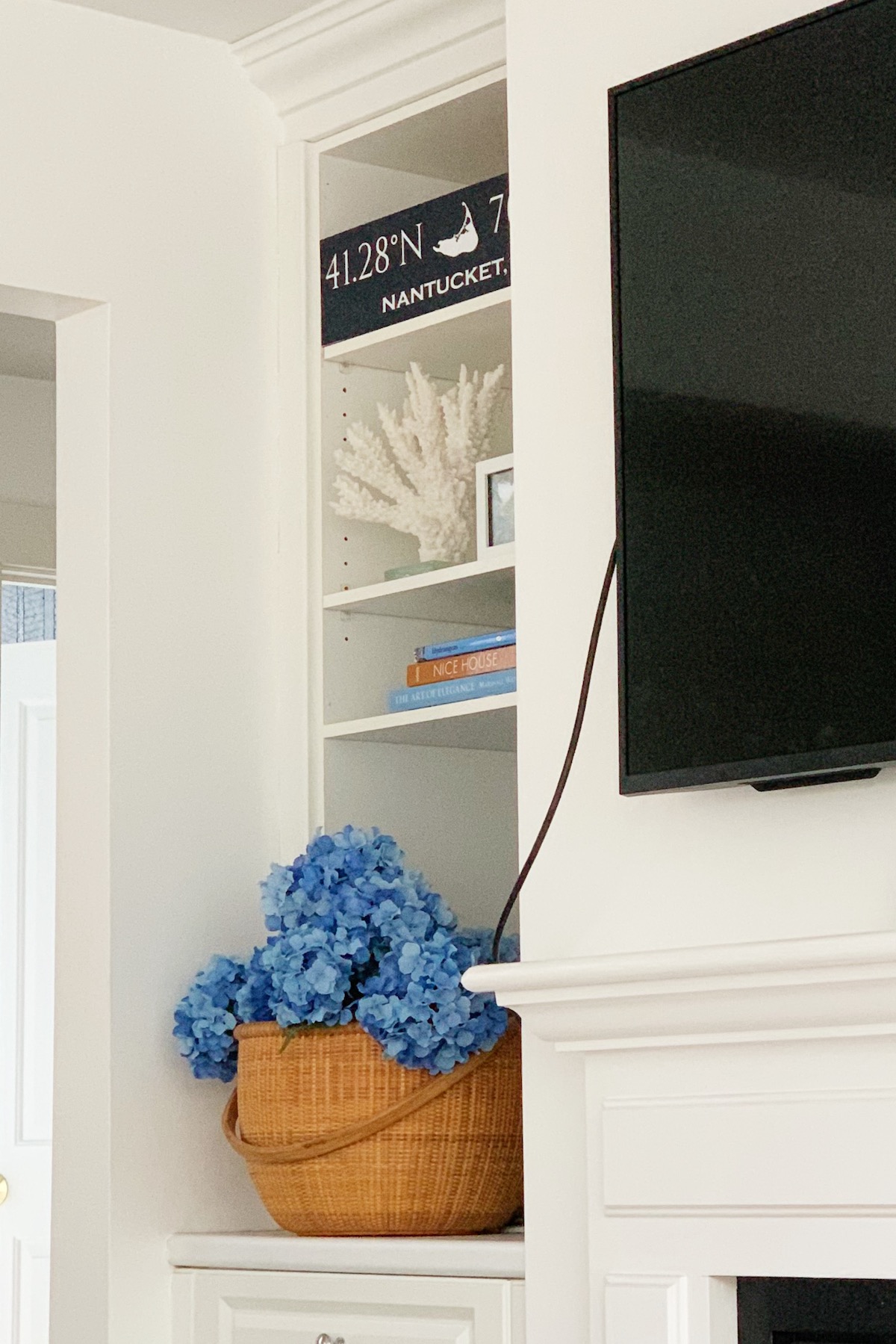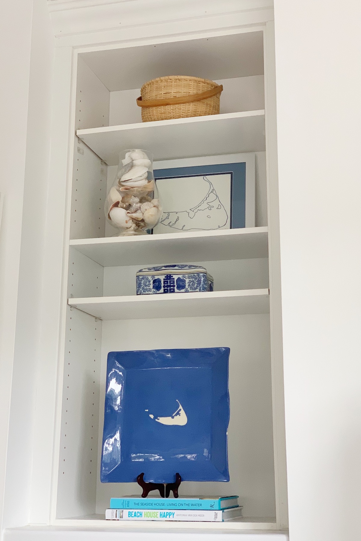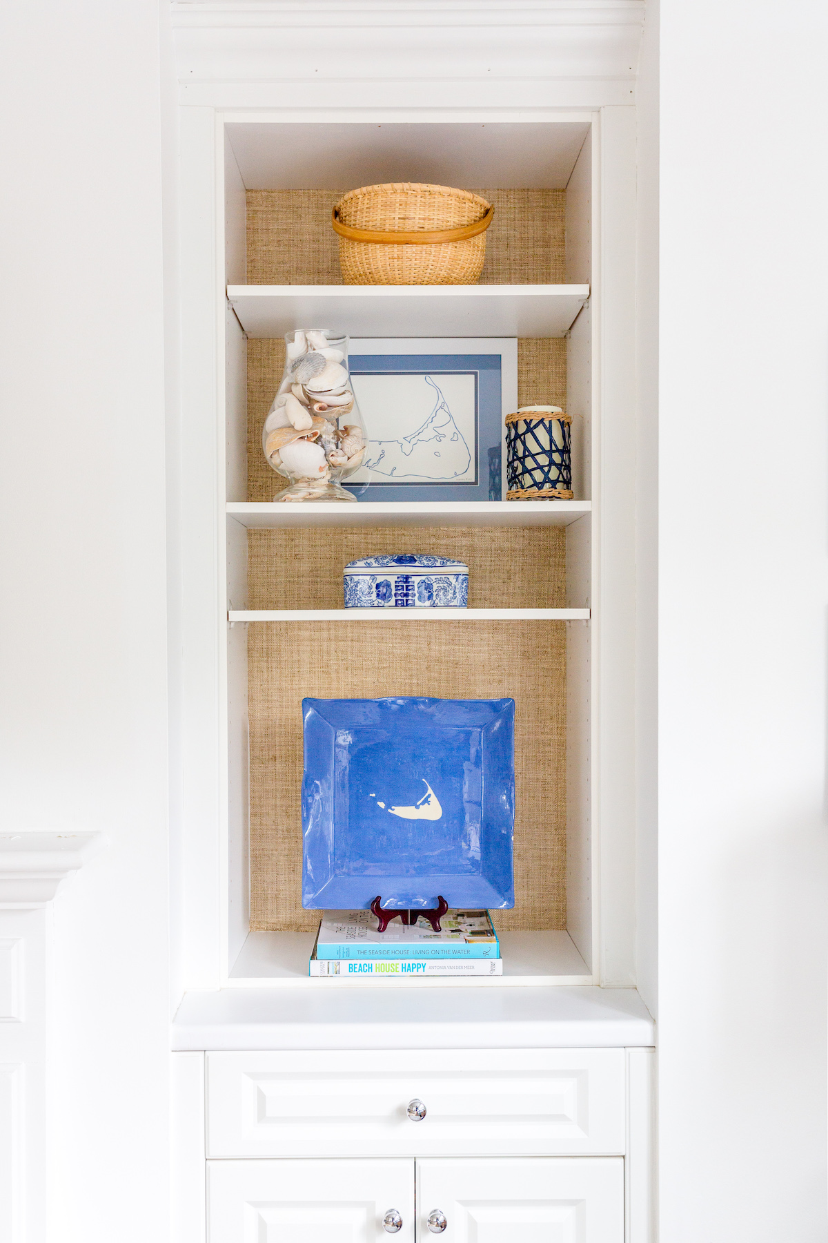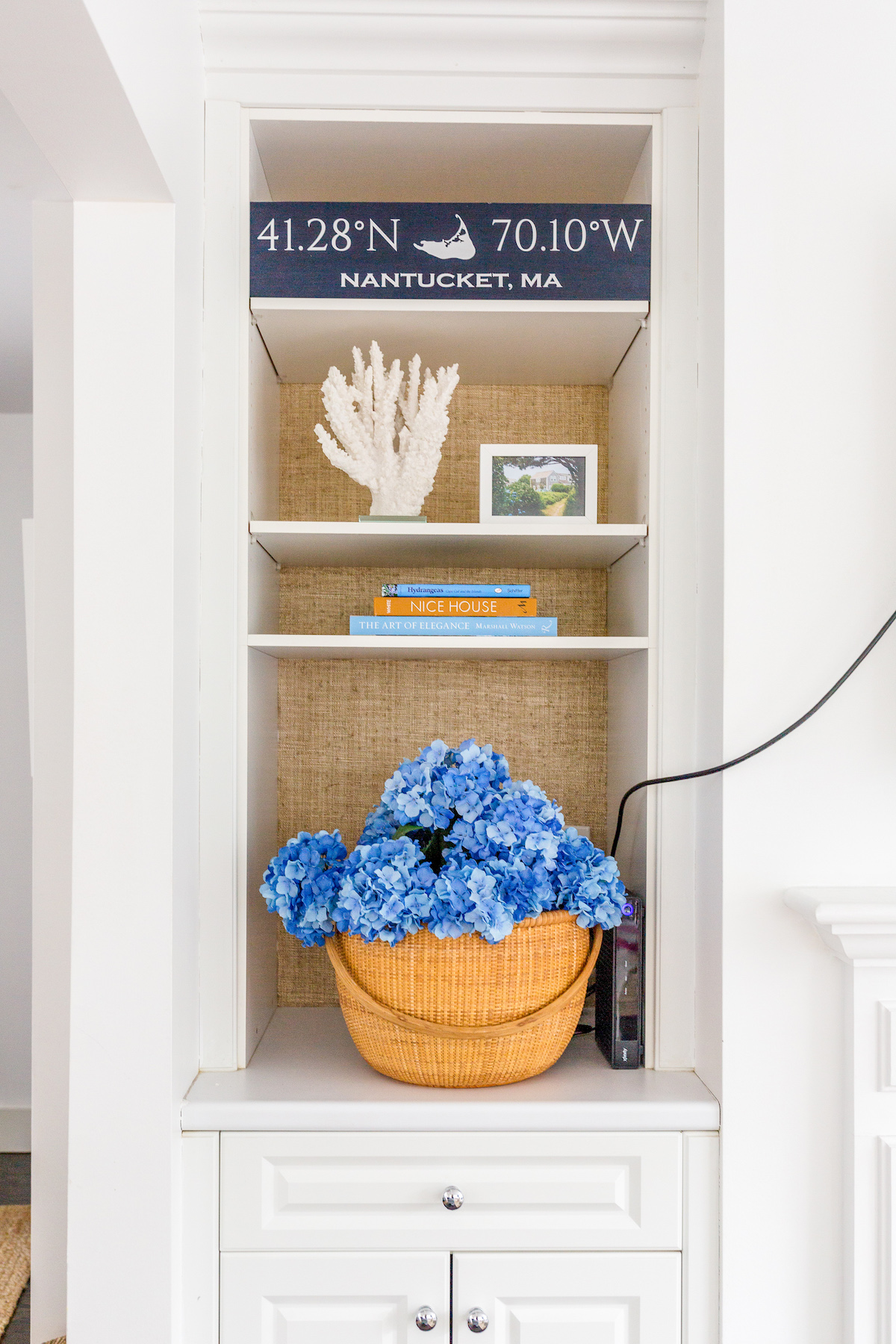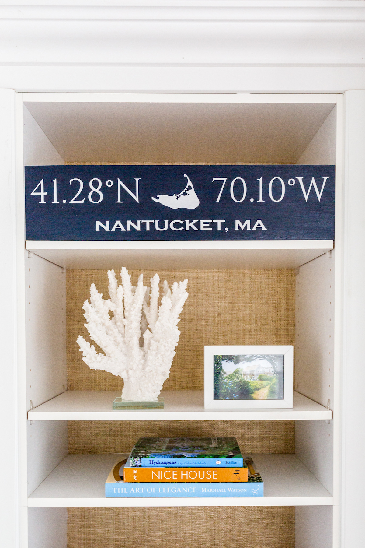 My mom and I recently tackled a fun decorating project at my family’s Nantucket house and I’m obsessed with how it turned out! We added grasscloth wallpaper to the backs of the built-in bookshelves in our living room and it instantly warmed up the entire space and made the bookshelves look more custom. I definitely want to recreate the look somewhere in our new house (which I’ll be sharing more about this week!). Here’s the before and after, plus an exclusive promo code for the custom coordinates sign: